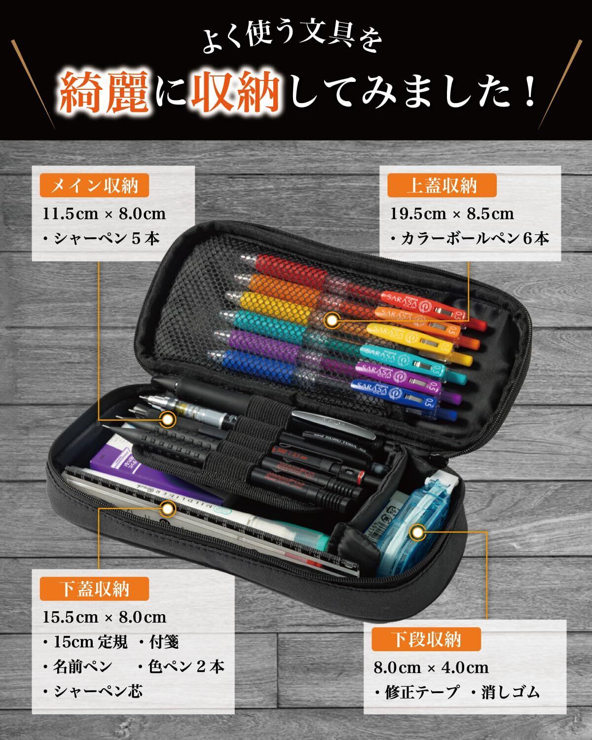 【実際に収納した文具一覧】 [シャーペン] スマッシュ 0.5mm、 スマッシュ 0.3mm、 クルトガ 、Dr.Grip ドクターグリップ 、 rOtring ロットリング [ペン類] サラサクリップ (赤、オレンジ、黄、ブルーグリーン、紫、青)、 マイルドライナーブラッシュ (マイルドブルーグリーン、マイルドオレンジ)、 マイネームツイン [小物類] 15cm定規 、 MONO消しゴム 、 修正テープMONO 、 ハイユニシャープ芯0.5mm 、 ポストイット Post-it