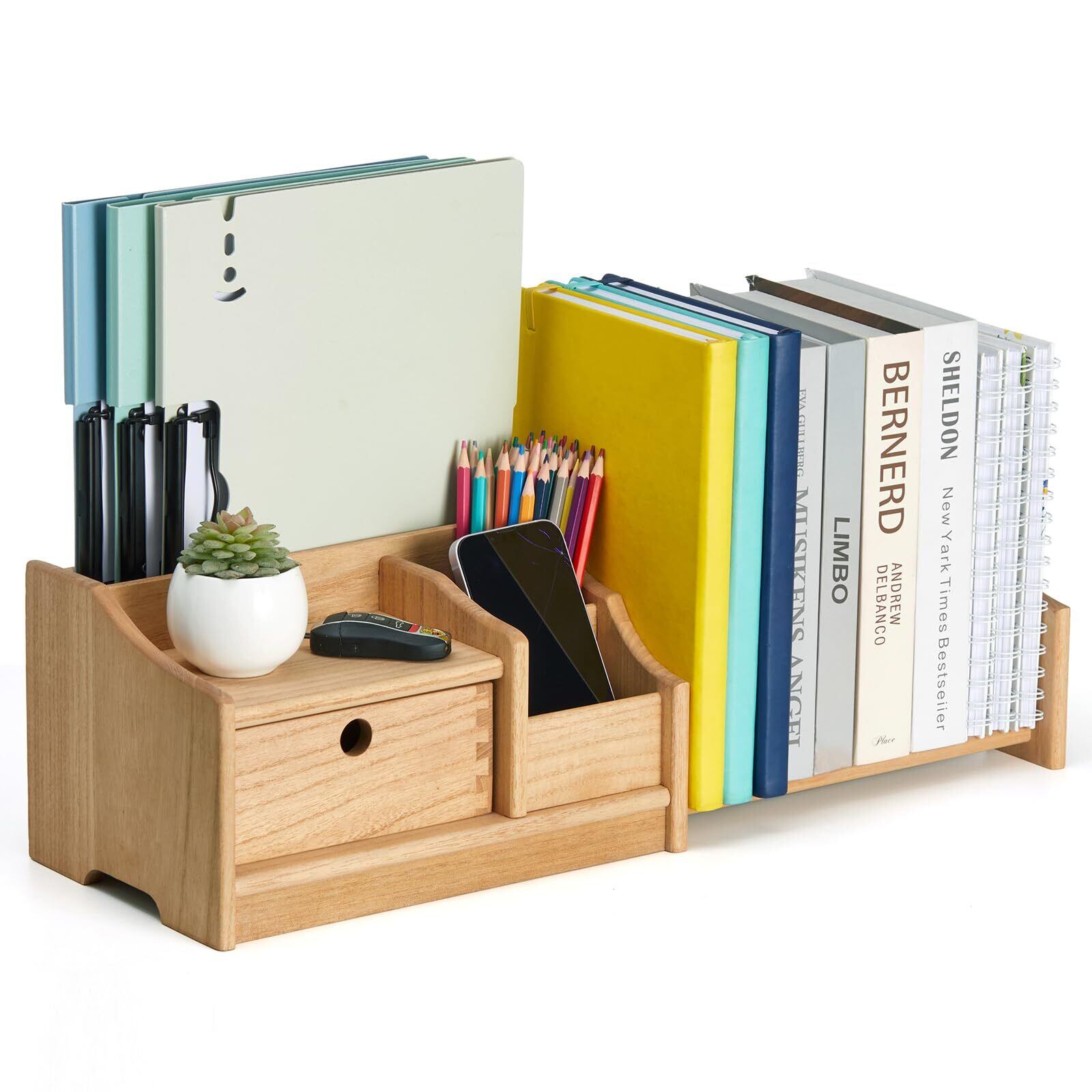 KIRIGEN 伸縮 ブックスタンド 本立て 引き出し 書棚 本棚 ブックスタンド デスク整理 桐製 卓上収納 雑誌 書類 ファイル ブックエンド事務用品 文房具 オフィス TQ-SSSSJ-NA (ナチュラル)