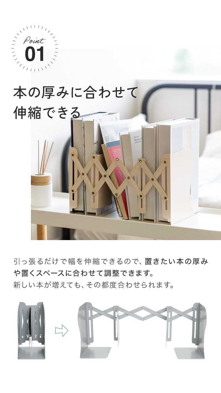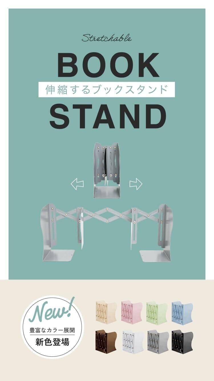 【伸縮でスペースを調節】10cm-43cmまでの幅調整ができる伸縮式のデザインで本の厚みに応じで調節し、ぴったり収まるので省スペースになります。散らかったデスクを整理整頓し、卓上の空間を有効活用します。