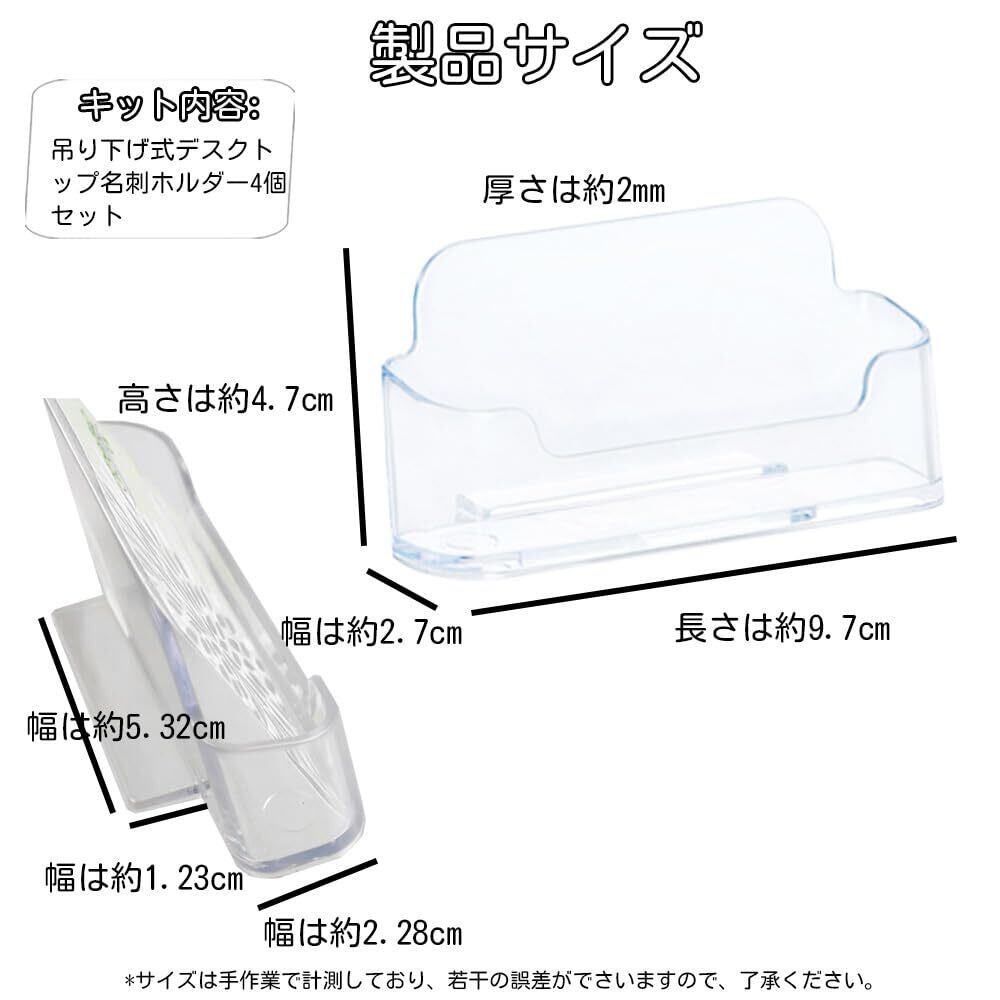 【商品内容】:吊り下げ式デスクトップ名刺ホルダー4個セット、サイズ:幅97mm×奥行き23mm×高さ48mm、材質:アクリル、収納枚数:ホルダー1個につき40~50枚まで。