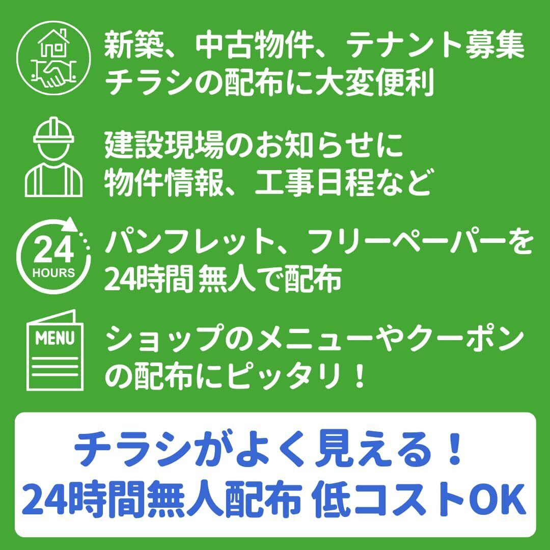 【使用例】ショップのメニューやクーポンの配布。新築、中古物件、テナント募集チラシの配布。フリーペーパー、パンフレットの配布などに大変便利。