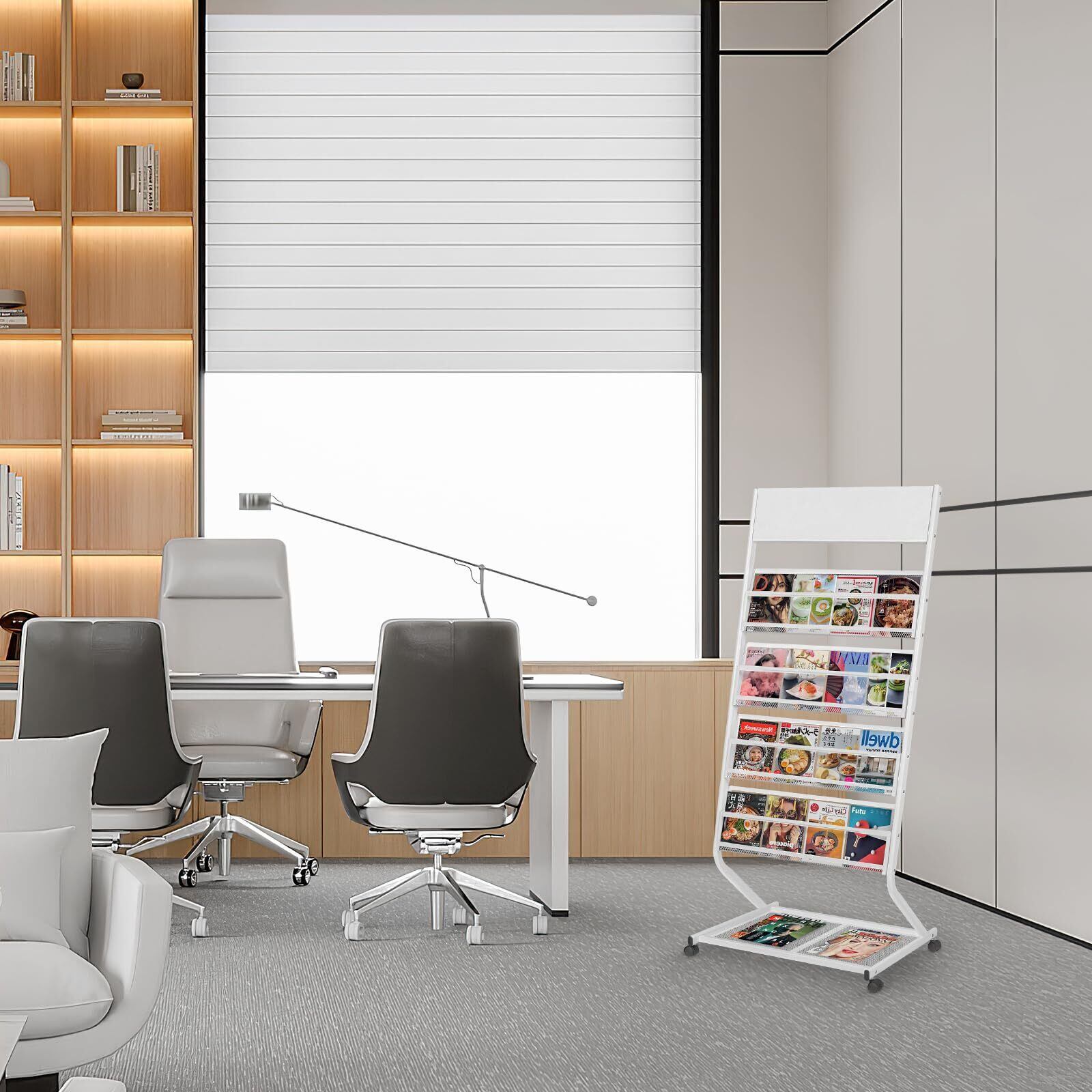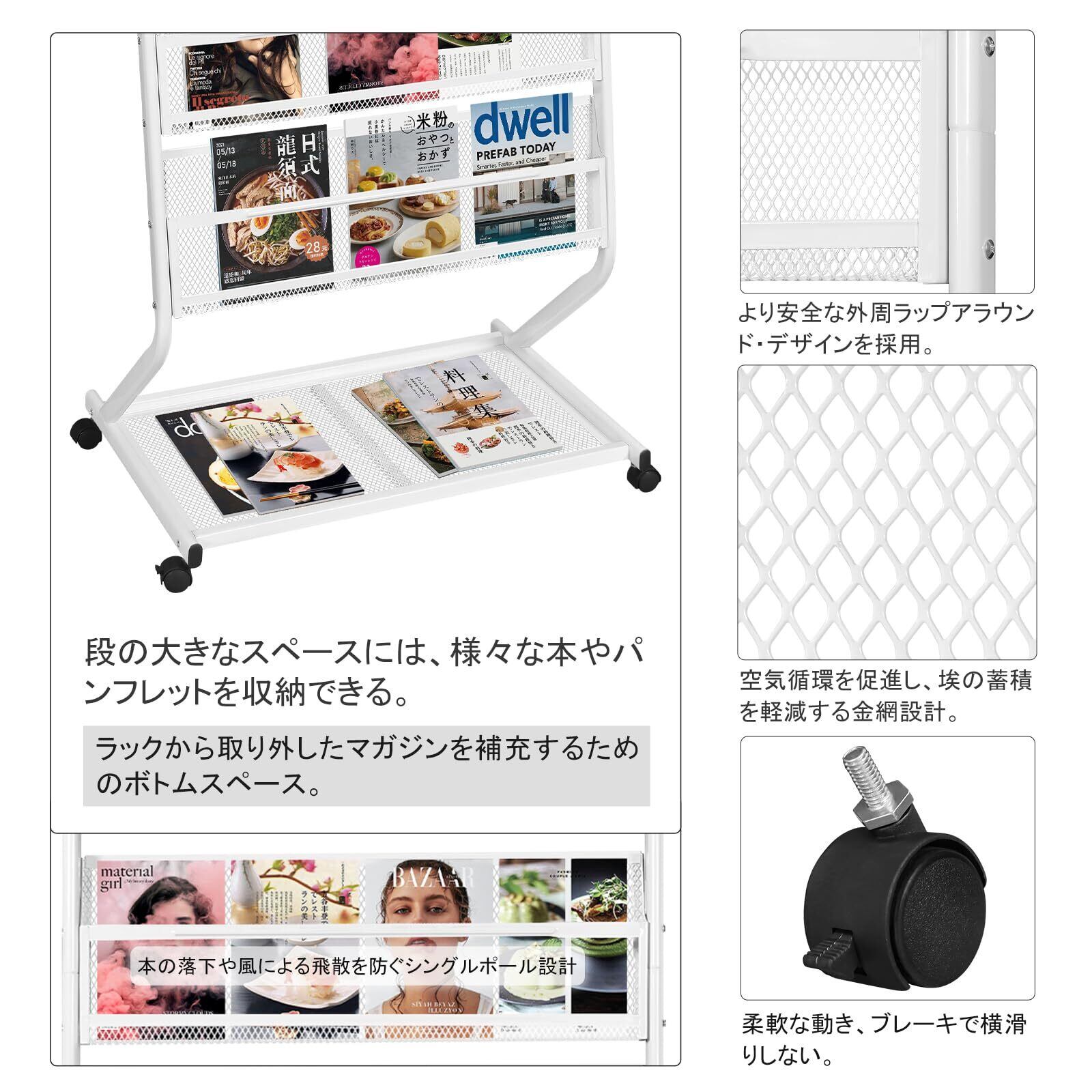 フロアパンフレットラックは高品質のスチール、ユニバーサルホイール付き,安定して動きやすい。 4セクショングリッド、下部には収納棚があり、大容量で、より多くのパンフレット、雑誌、本を収納できます。