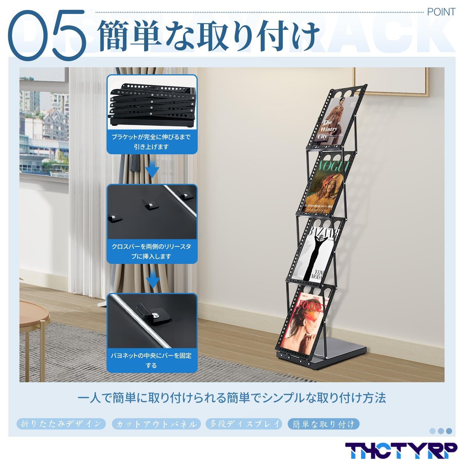 折りたたみ式 4層 マガジンラック カタログスタンド A4対応 アイアン製 ディスプレイラック 片面パンフレットホルダー 省スペース 展示会/リビング/寝室用 コンパクト収納 (ブラック)