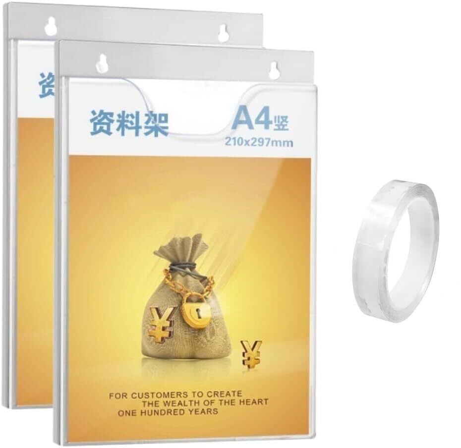 【商品仕様】:素材:アクリル、カタログスタンドのサイズ:22.2*32.2*1.3cm、収納可能な紙のサイズ:21*29.7cmまで、セット内容:カタログスタンド*2個+強力両面テープ*1個