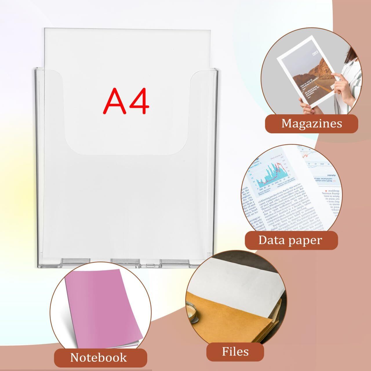 シンプルなデザイン:滑らかなラインのクリアパンフレットホルダーは、オフィスや学校、家庭のインテリアに自然に馴染み、空間の雰囲気を崩さずスマートに設置できます。