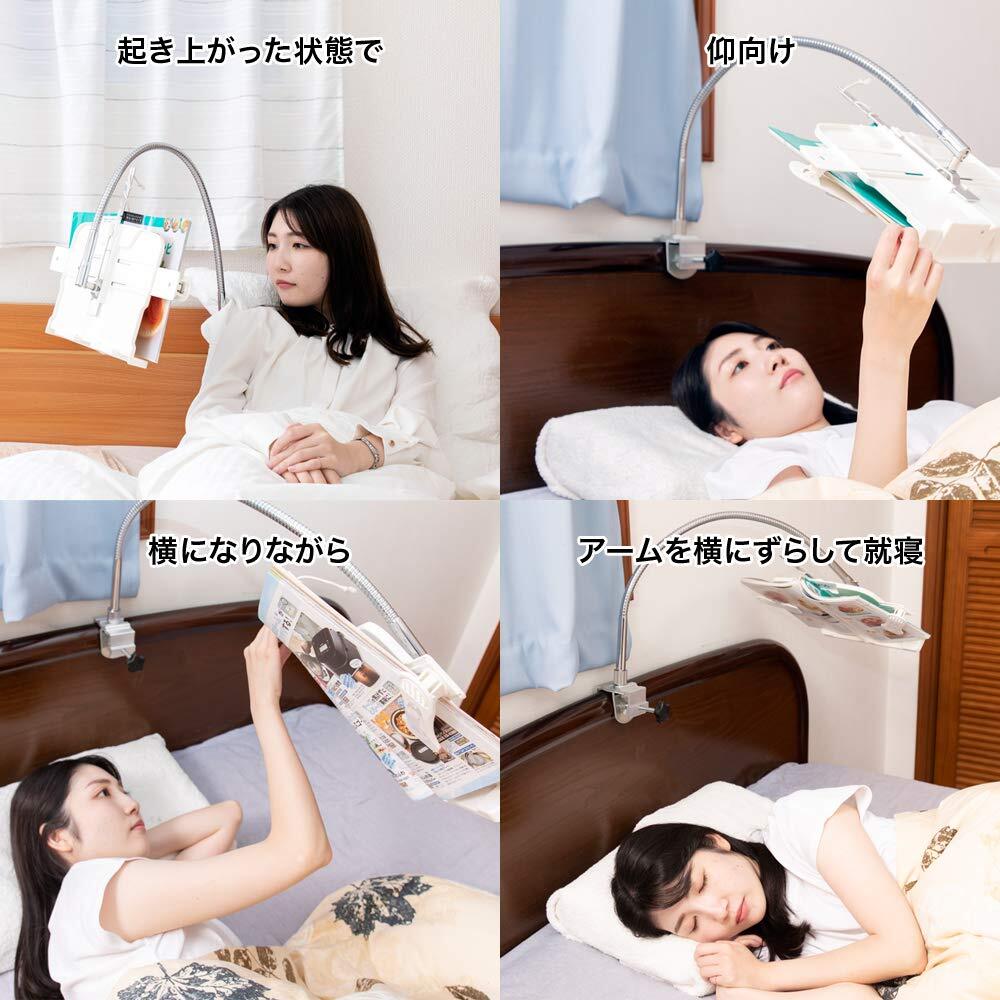 【ベッドで寝たまま快適読書】 両手を使わずにベッドに入りながら本が読めるブックアームスタンドです。ベッドのヘッドボードにブックアームスタンドを固定してご使用ください。販売者も実証済みですが読書がとても快適になります。介護や入院中のベッドの中での読書にも役立ちます。ブックスタンドのクリップを調整してご使用ください。