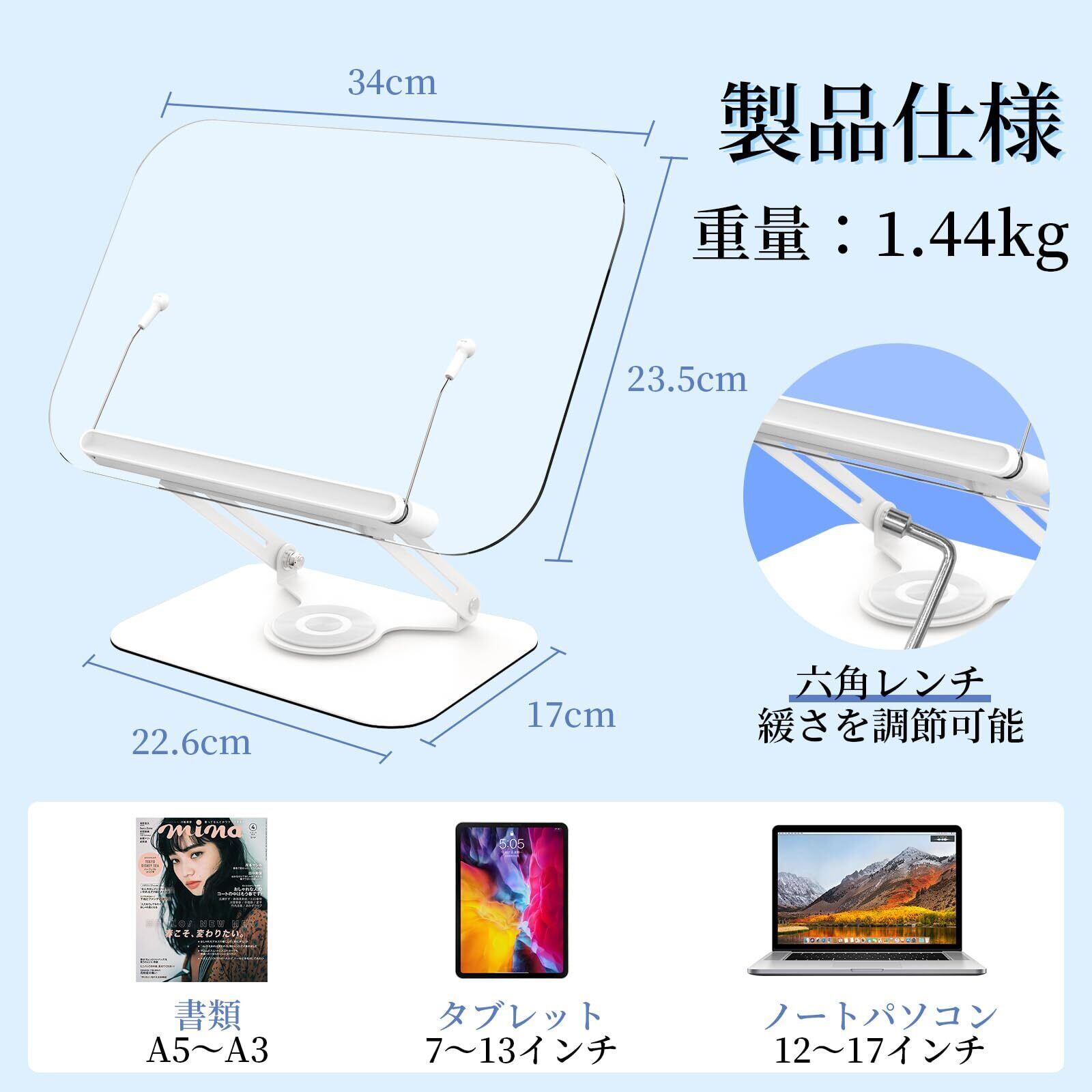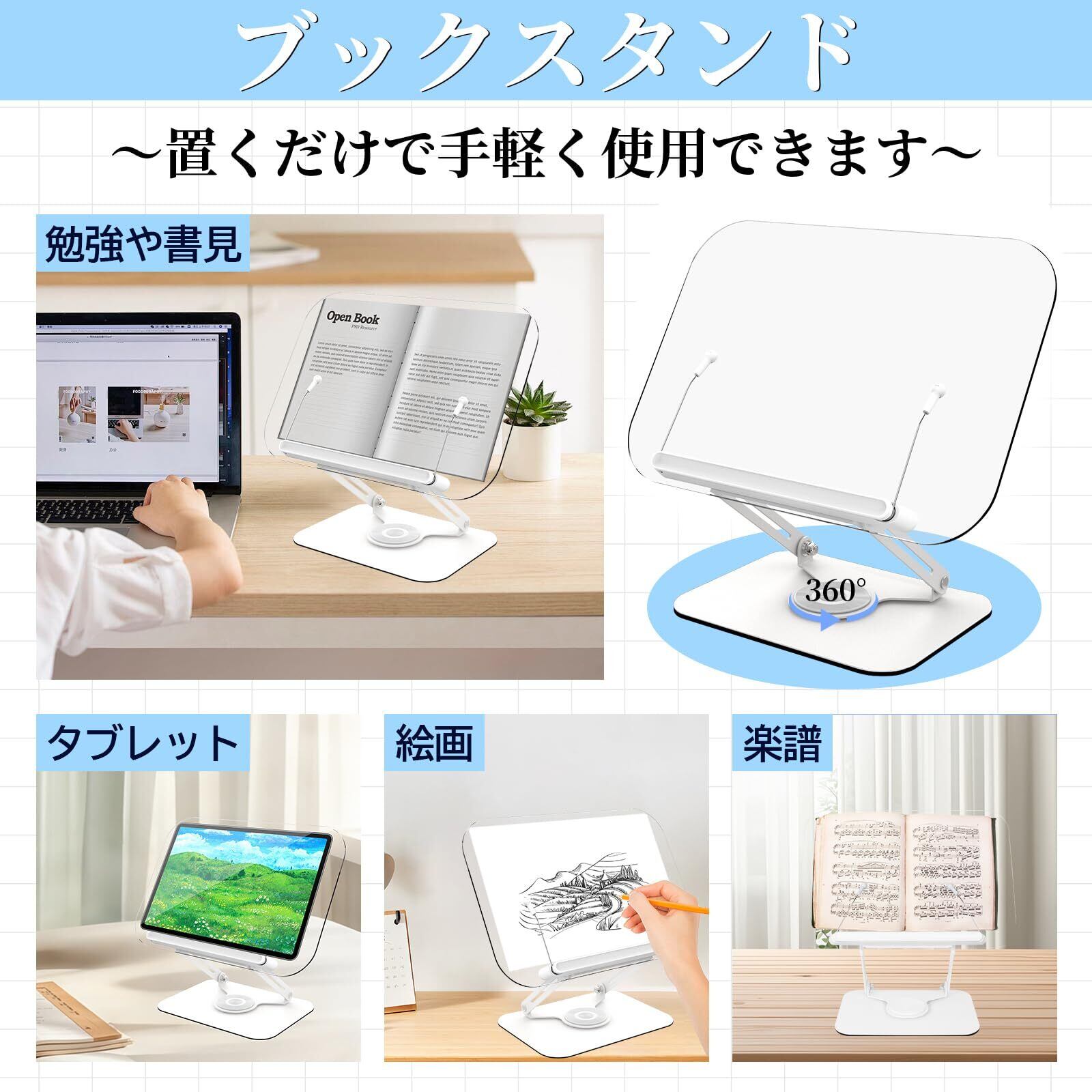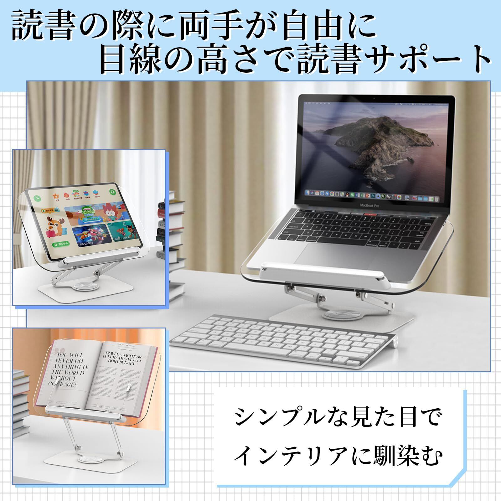 書見台 ブックスタンド 読書台 読書スタンド 卓上 折りたたみ式 アクリル製 ブックホルダー 360°回転 アルミ合金 角度/高さ無段階調節 安定性抜群 持ち運びやすい 勉強 姿勢改善 料理本/ラップトップ/タブレット/楽譜/レシピ/教科書用 (アクリル)