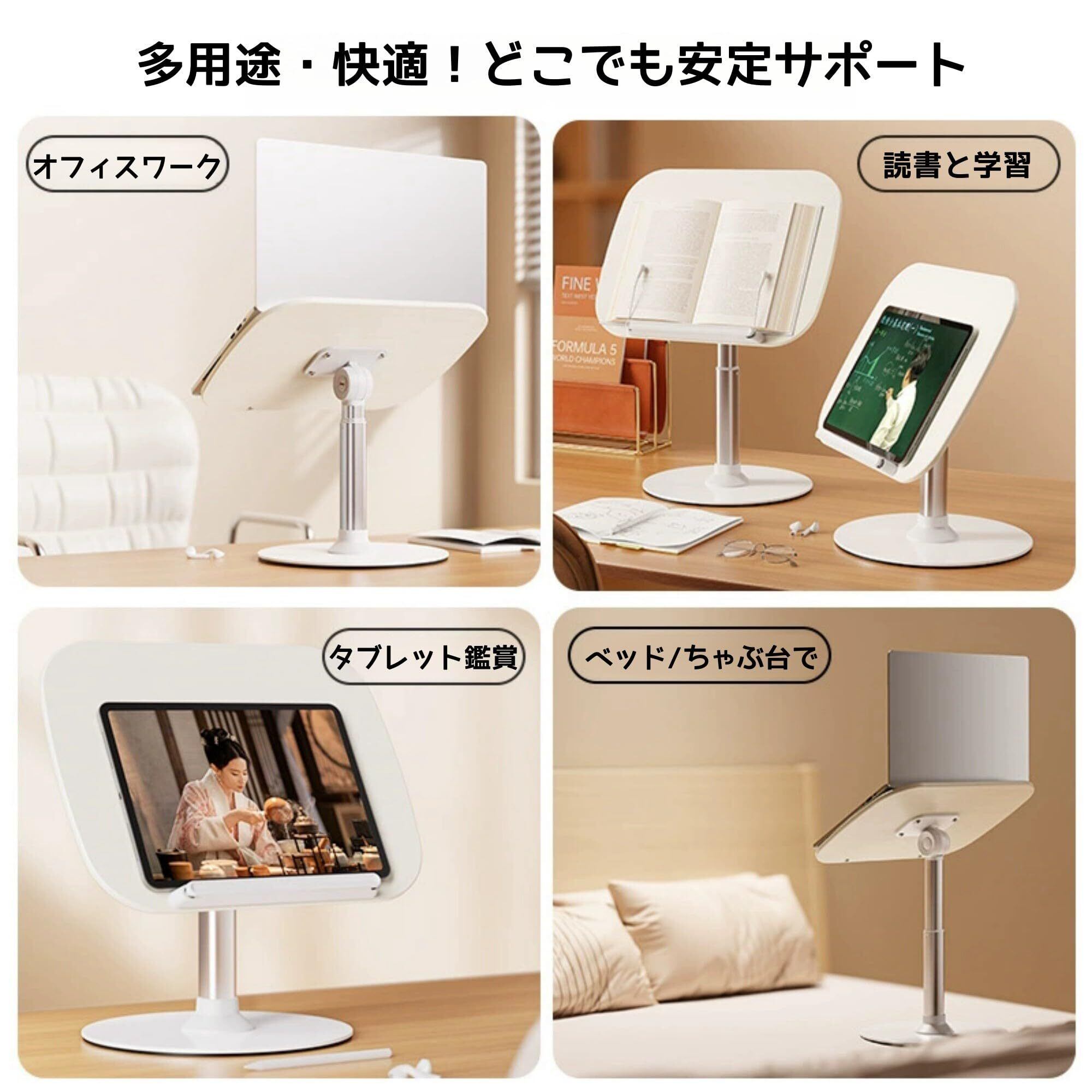 【頑丈設計・スムーズ伸縮】この書見台は、3段式アルミニウム合金スリーブ構造設計を採用しており、最先端のスマート自動抵抗伸縮技術を内蔵しており、ロックバックルなしで高い耐荷重と落下防止を保証します。フルメタル拡大ベースは安定性を保証し、柔らかいパッドは上やベッドでも使用できます。パネル背面の拡大された回転軸は安定しており、内蔵の90°リミット設計により、パネルを水平に置いたときにパネルが後方に回転するのを効果的に防ぎます。