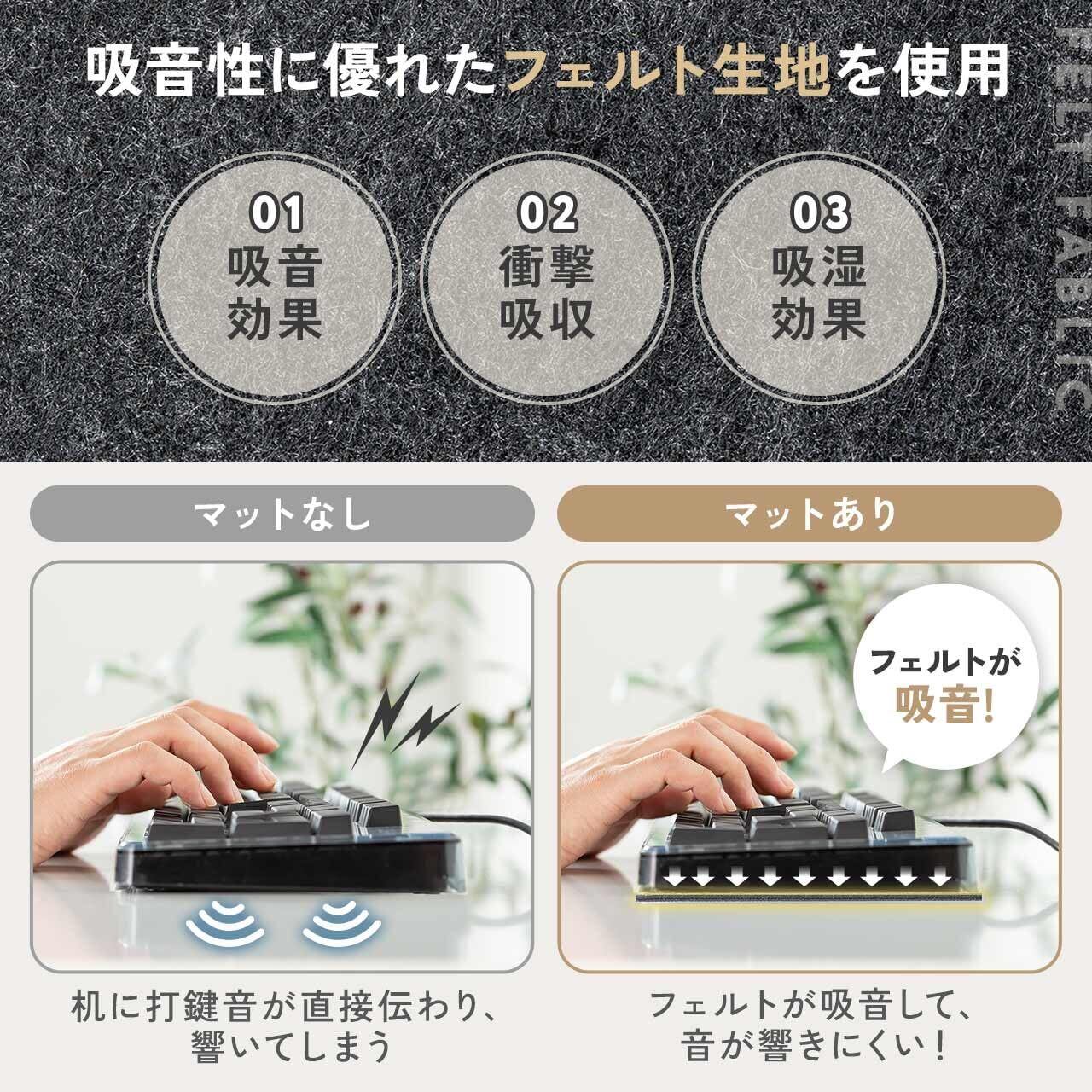吸音 性に優れた特殊な フェルト生地 を使用した マット です。机に打鍵音が直接伝わって響いてしまうのを、フェルトが吸音し、音が響きにくくします。
