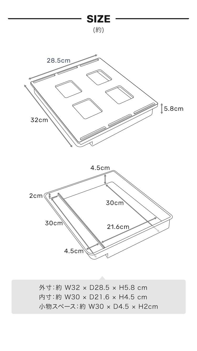 【サイズ】外寸:幅 32cm × 奥行 28.5cm × 高さ 5.8cm 内寸(トレー):幅 30cm × 奥行 21.6cm × 高さ 4.5cm 小物スペース:約 W30 × D4.5 × H2cm 【カラー】ブラック