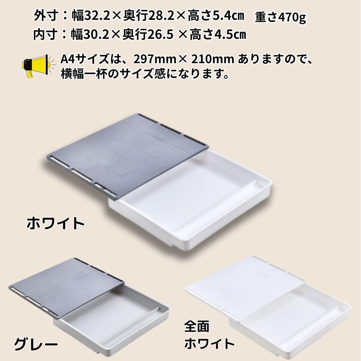 大サイズ(全面ホワイト, 大):幅32.5cm×奥行28.2cm×高さ5.6cm 470g 内寸:幅30.2㎝ 奥行26.5 高さ4.5㎝ 重さ470g、(A4サイズは、297mm×210mm ありますので、 横幅一杯のサイズ感になります)