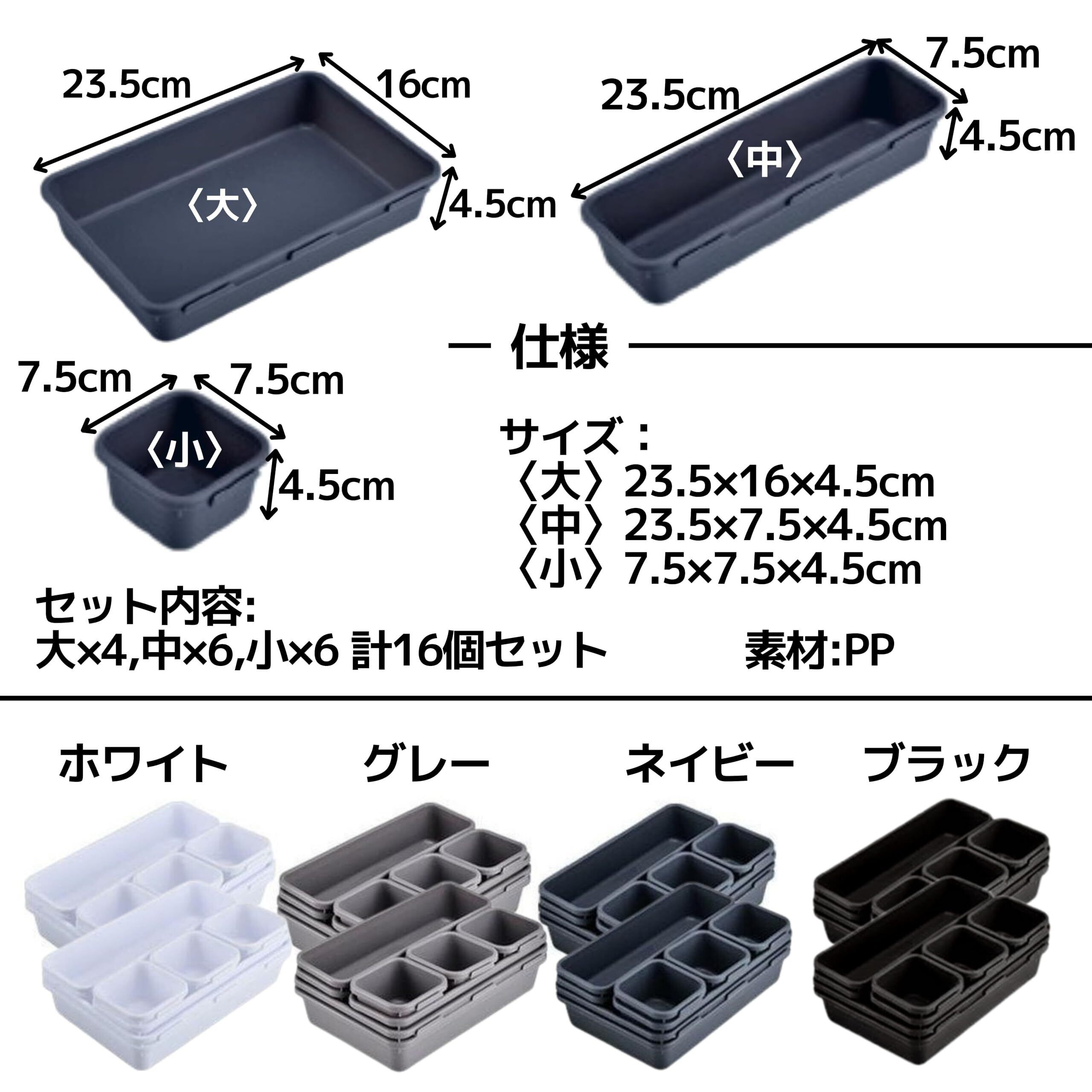 【仕様】サイズ:〈大〉23.5×16×4.5cm、〈中〉23.5×7.5×4.5cm、〈小〉7.5×7.5×4.5cm 、素材:PP、カラー:ブラック 、セット内容: 2セット(大4個、中6個、小6個 計16個セット)