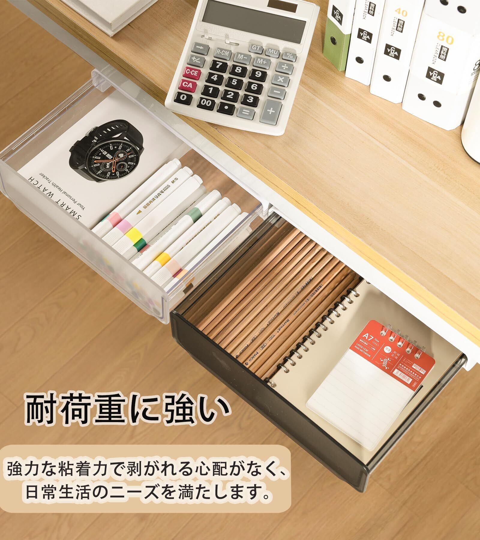 【適用場所】テーブルや棚下の隙間やデッドスペースが活用できる取付式引出しです。オフィス、家庭、学校など小物収納のシーンで活躍します。散らばった小物をスッキリ収納出来、必要なものを素早く見つけられるので生活効率を向上させます。