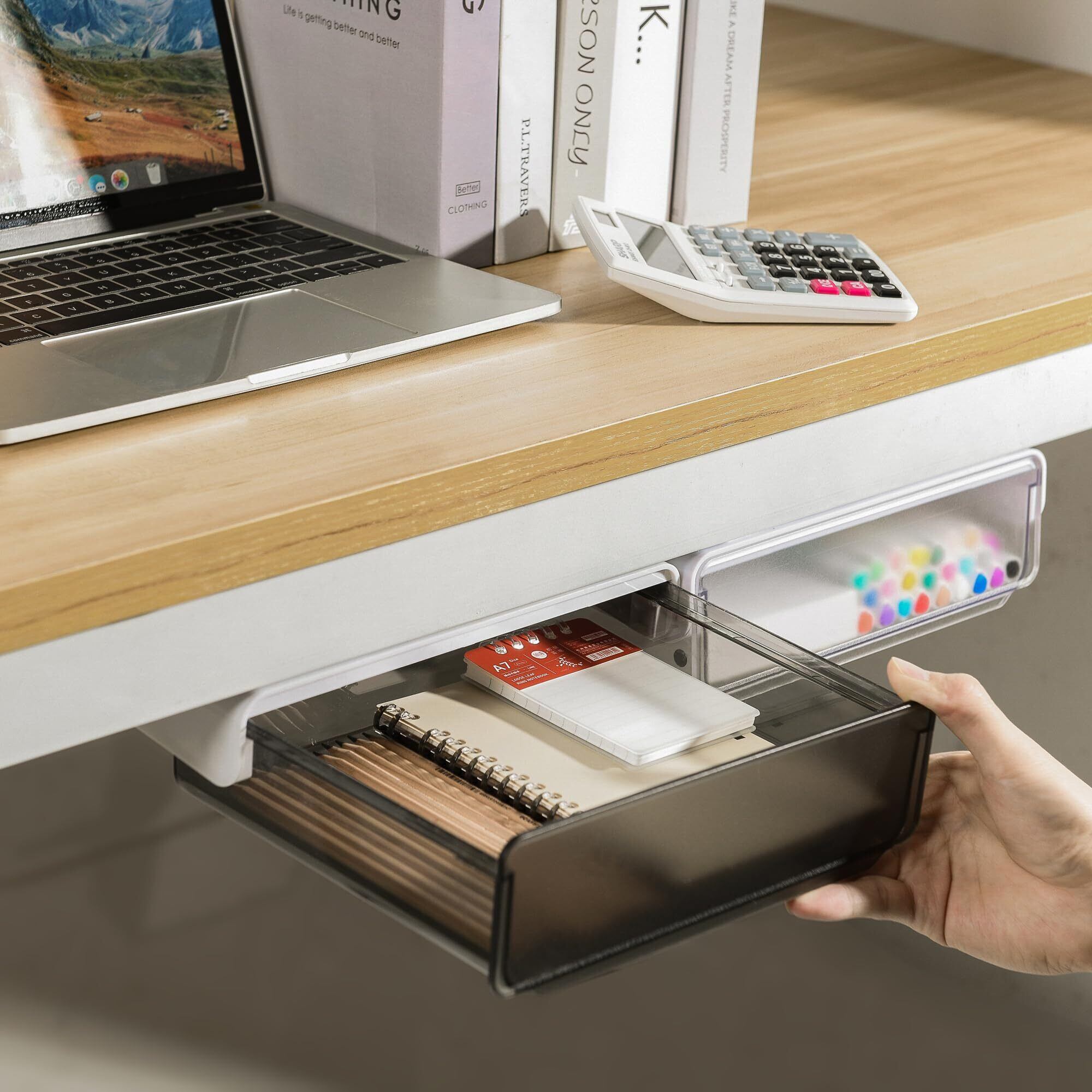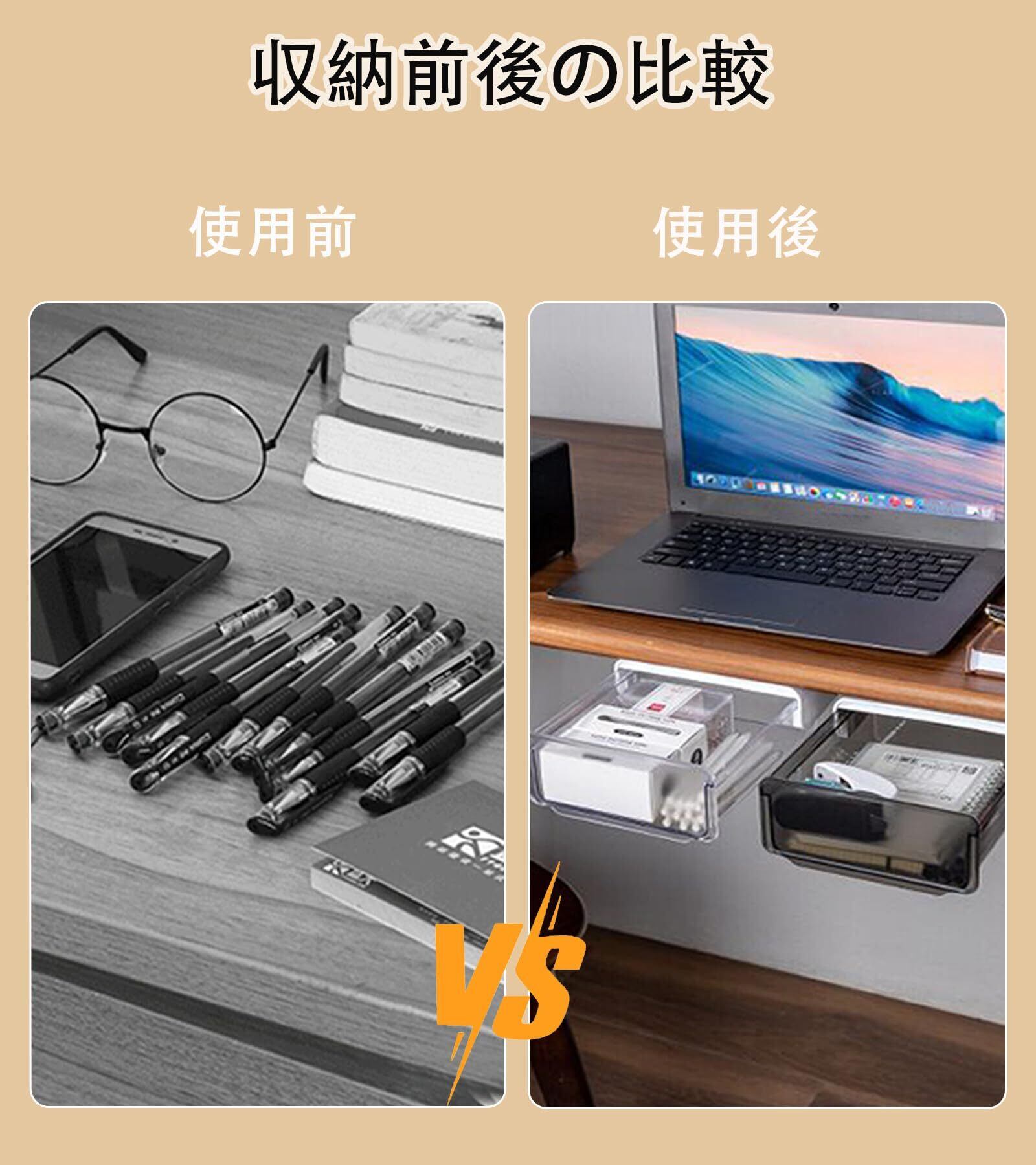 【簡単に取り付け】工具は不要で、設置も簡単です。強力粘着両面テープを貼るだけで、スライド式後付け引き出しが完成します。スライド式の収納ボックスなので、素早く簡単に物を取り出せます。背面に軽量で省スペースな引き出しが付いています。(貼り付ける前に、テーブル下をきれいにしてください。)