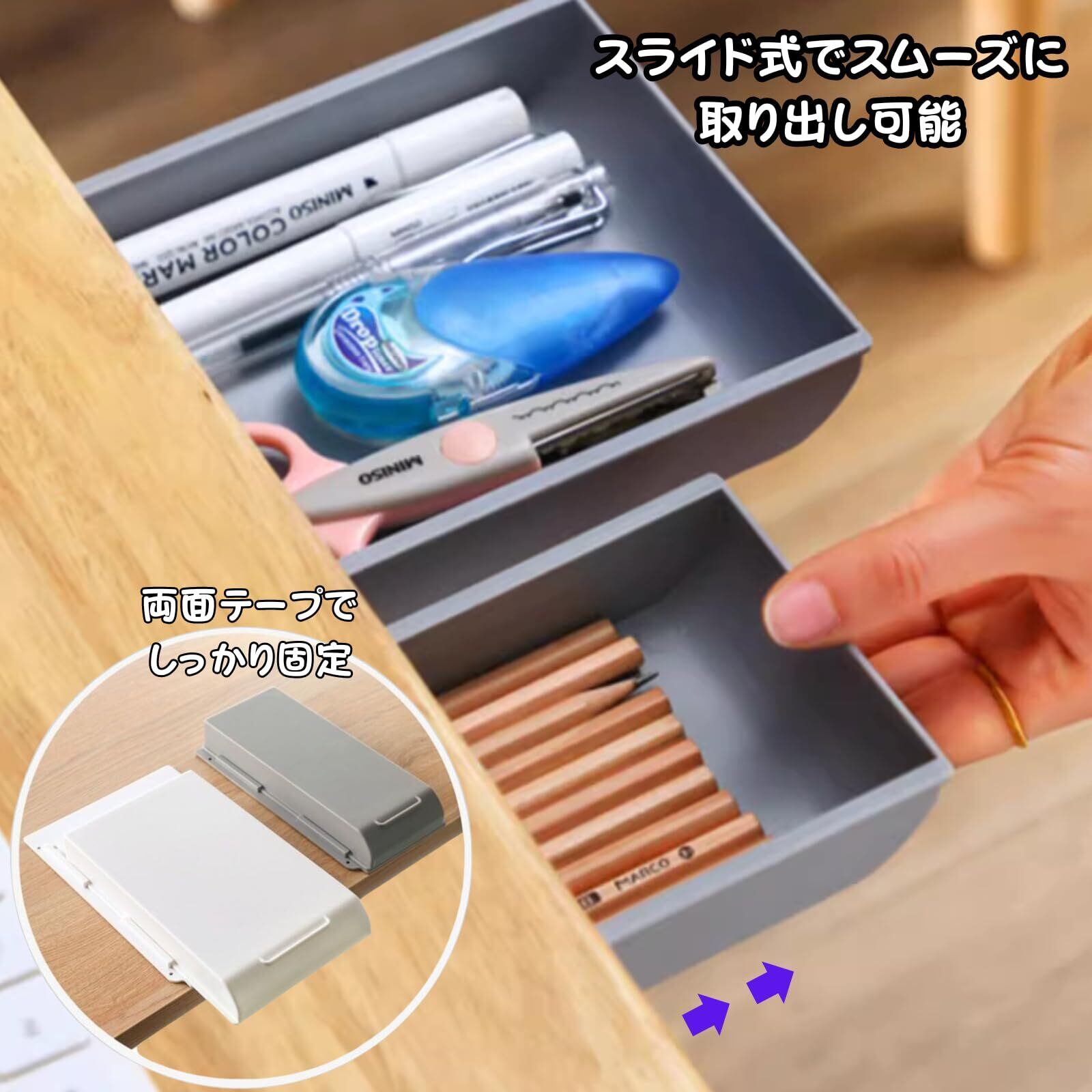 デスク下をキレイに整理整頓: デスクや机の上がハサミやペンなどの小物で散らかっておりませんでしょうか? デスクの上で散らかりやすい小物などを綺麗に収納することができます。デスクや机下に隠せるタイプとなっておりますので、収納のためのスペースを確保する必要がなく、デスク上を広く使用することができます。ペンや小物類はもちろん、イヤホンなどもしっかり収納可能なミニ引き出しとなっております。また、取り付け方法は非常に簡単で机の下に両面テープで張り付けるだけです。※デスクに限らずキッチンや棚などにもご使用いただけます。オフィス、書斎、リビング、台所、浴室などのデットスペースに簡単に取付できます。スムーズに引き出せるレール式。