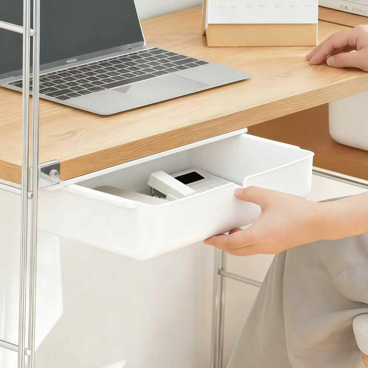 1.さまざまなシナリオに適しています:これはデスクの下の引き出し収納ボックスで、デスク、化粧台、キッチンなどの場所で文房具、化粧品、キッチン用品、その他の小物を保管するのに適しています。デスクトップ領域を占有することなく、使用されていないデスク下 収納スペースを活用できます。