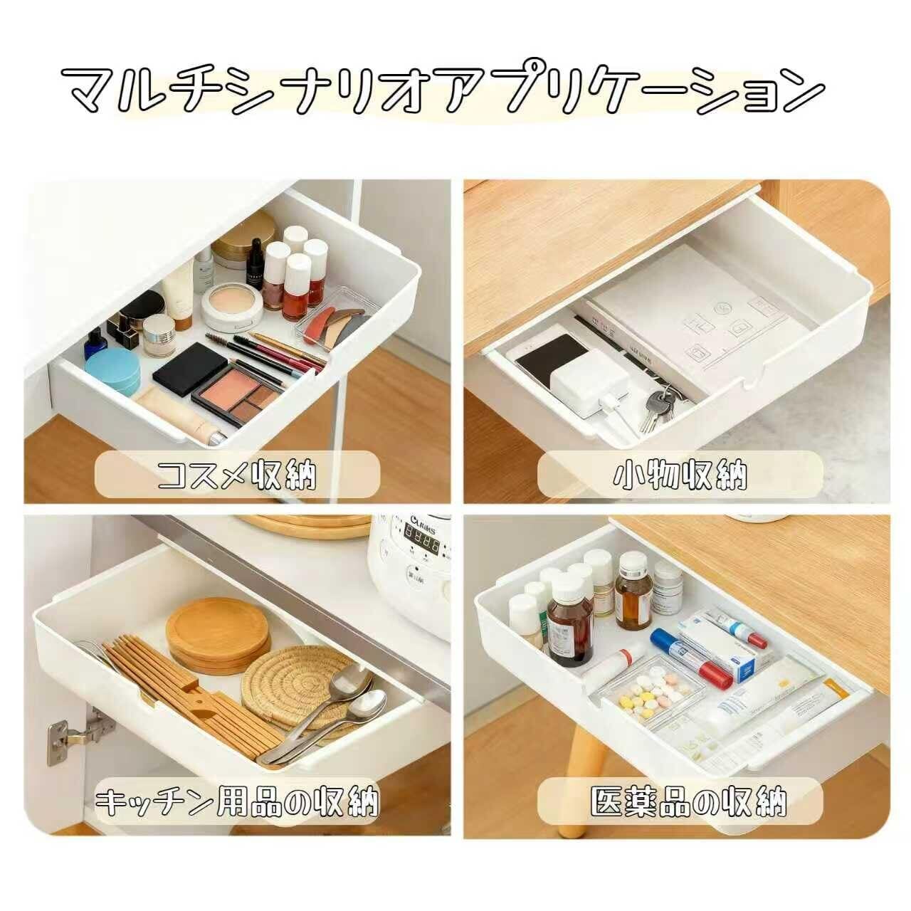 4.使いやすさ:引き出し式の開閉設計により、スムーズな操作と収納物の出し入れが容易です。引き出し 後付けは工具を使わず簡単に取り付けられます。両面の強力な粘着テープをはがし、お好みの場所に貼り付けるだけです。穴あけ加工は不要で、家具を傷つけることはありません。