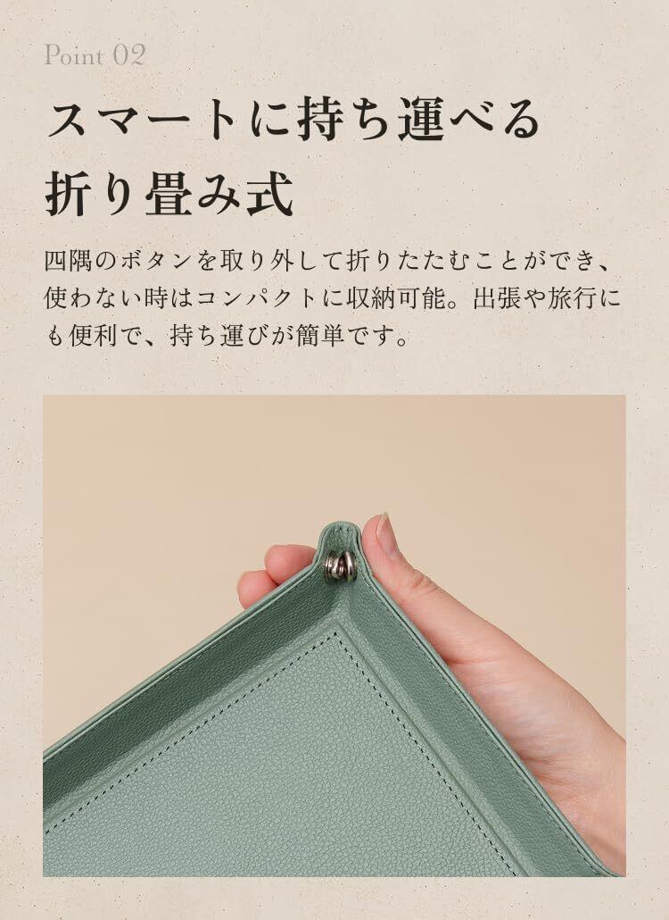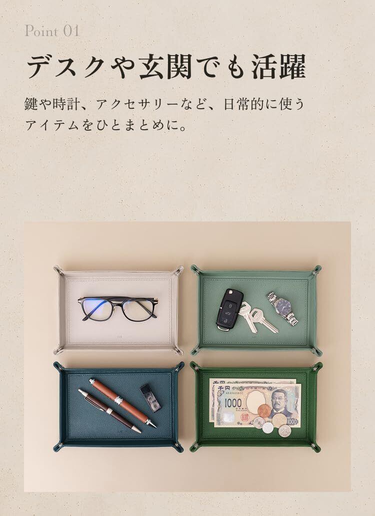 【小物が品よく収まるレザートレイ】シンプルデザインで、空間に馴染むレザートレイ。出張や旅行先でも持ち運びやすく、大切な小物の定位置として活躍します