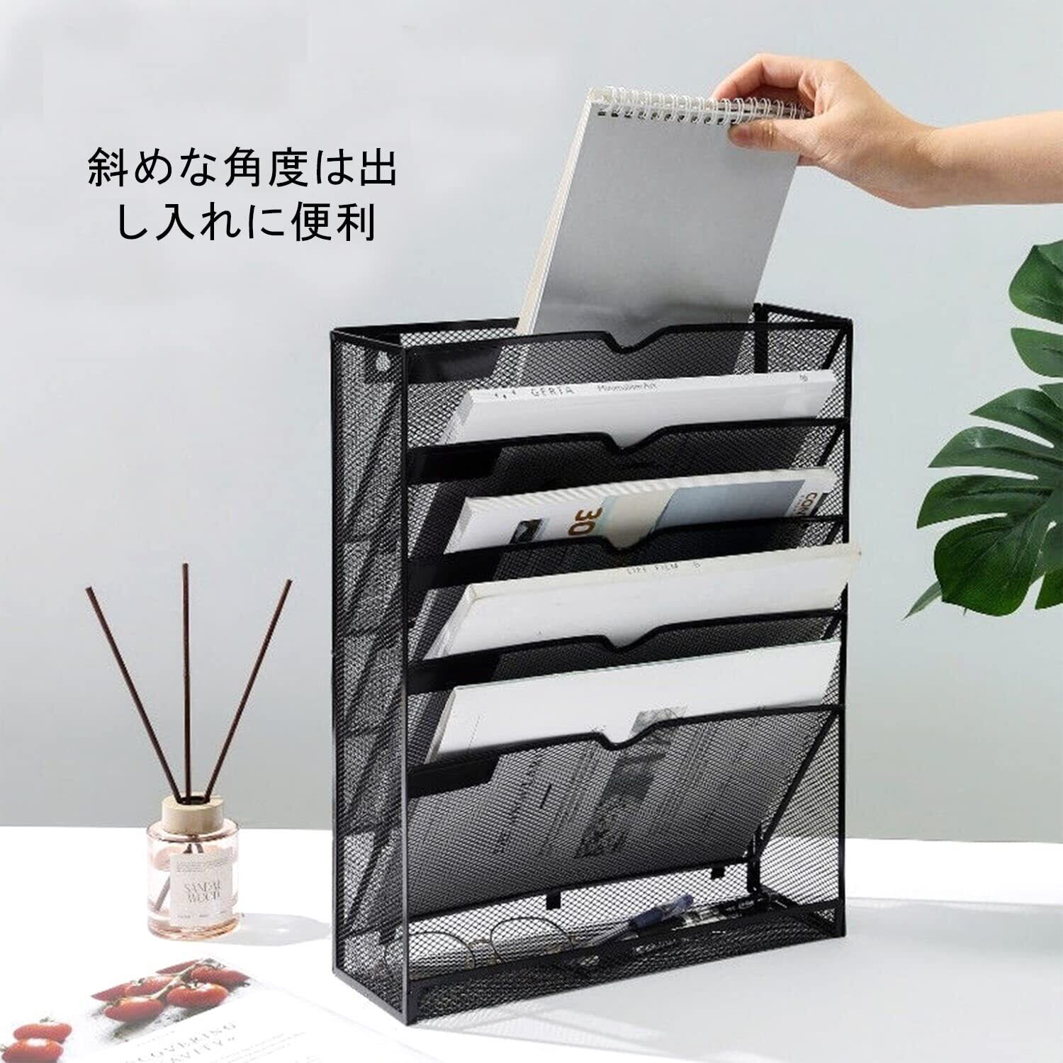【高品質素材】サイズ:41cm * 33cm * 11cm。このファイルスタンドは金属メッシュを採用して作り、製品本体は軽くて丈夫、耐久性もあります。しっかりと処理した溶接細部により一体成型なので良く安定感を持ってます。ファイルトレイは5つの棚板がご自由に取り出しますので、ファイルの整理整備に便利です。下のトレイは便箋、ボールペン、クリップ、ホッチキスなどの収納にも便利です。