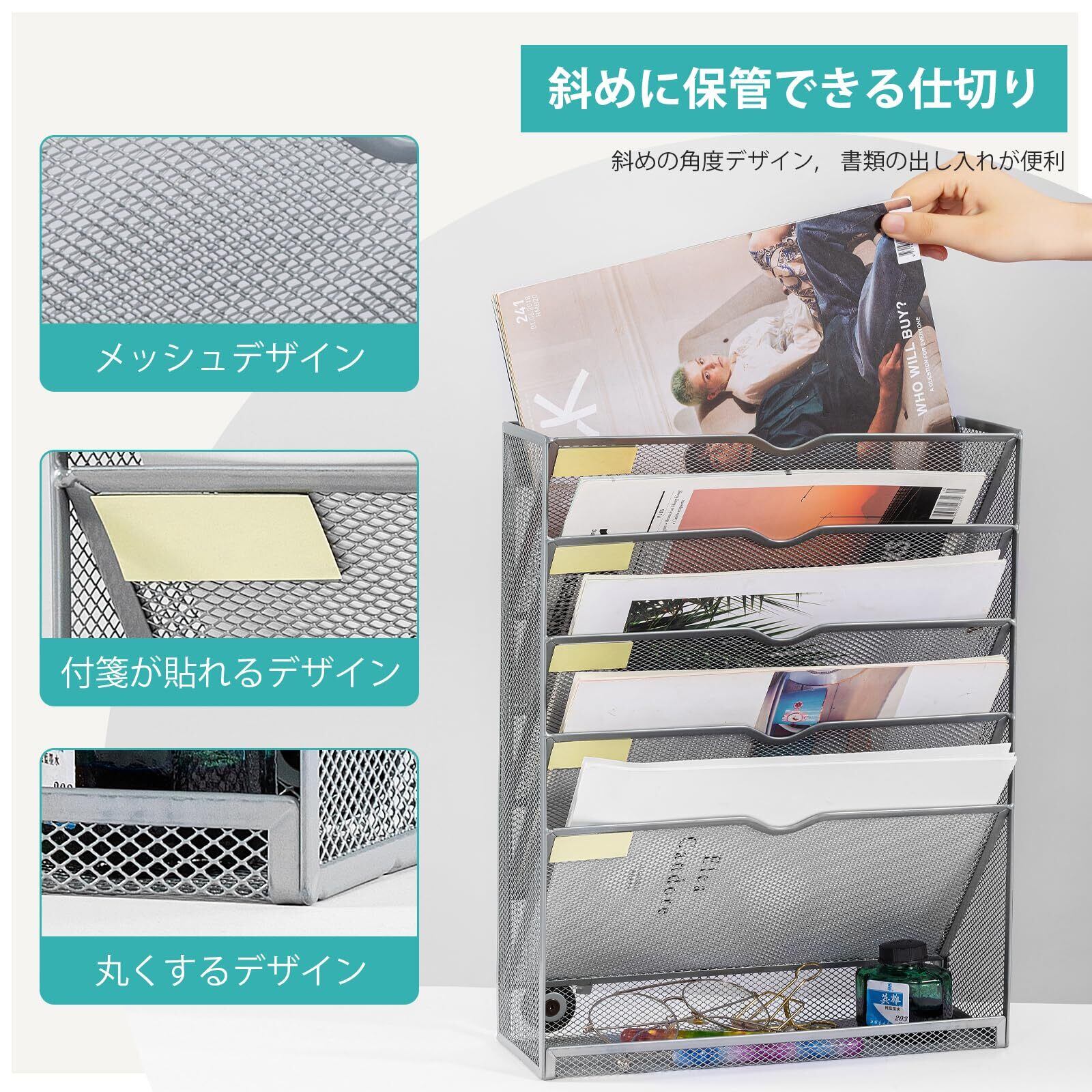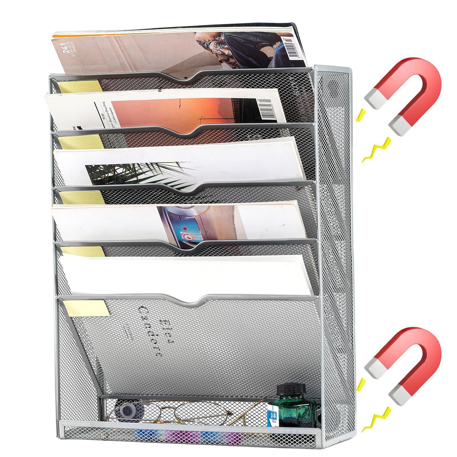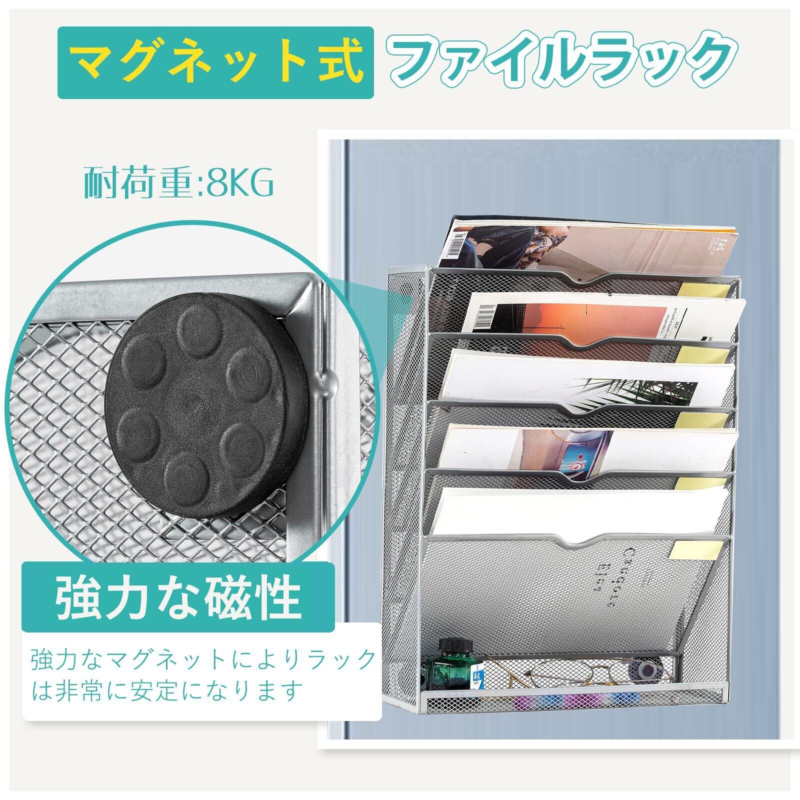 【2022最新】【最新昇級版】マグネット式 ファイルラック 6段 壁掛けファイルラック 卓上収納ラック 書類トレー 壁掛け書類ラック 組み立て不要 多機能 新聞 雑誌 A4ファイル 書類入れ 書類整理 大容量 40.6x31.7x11cm (シルバー)