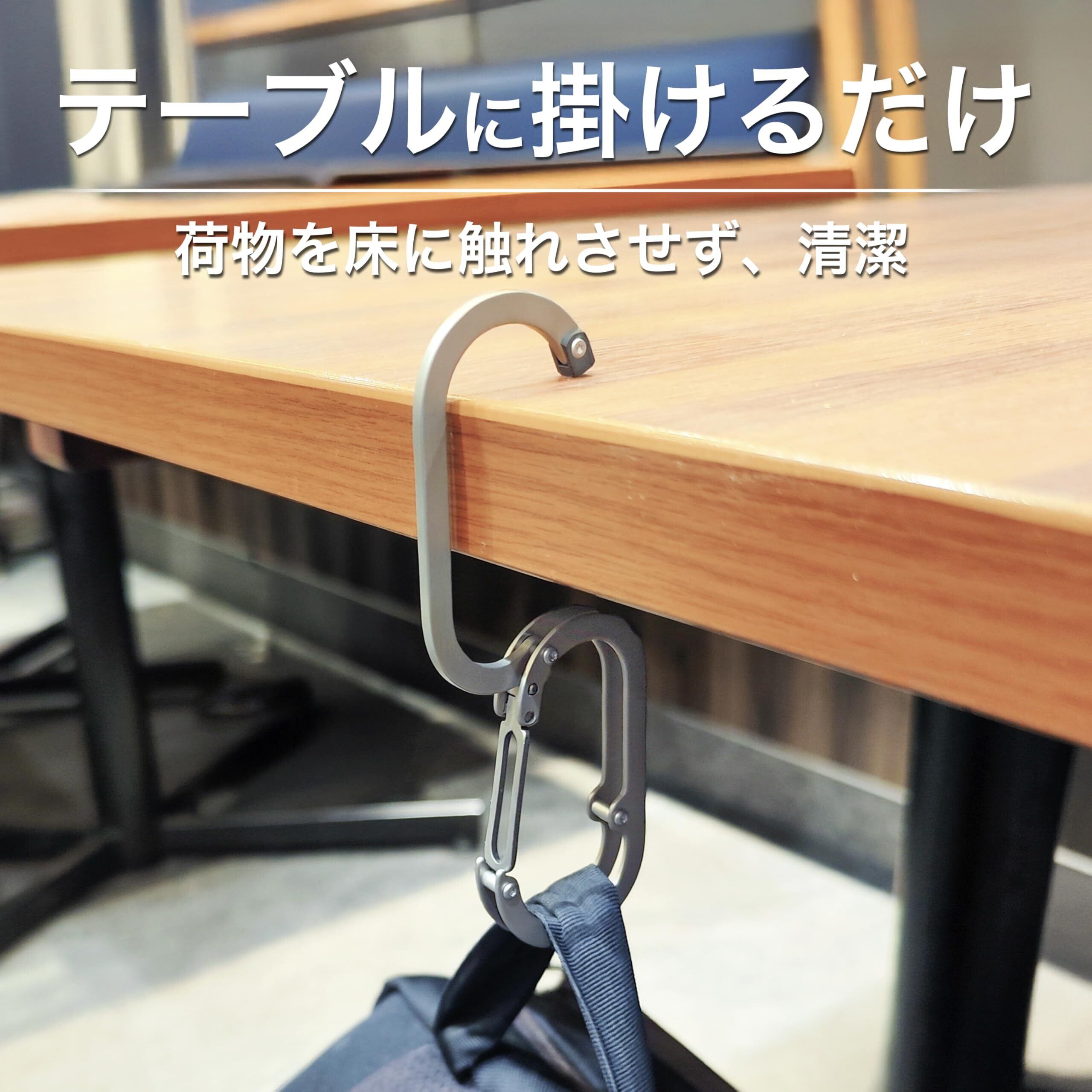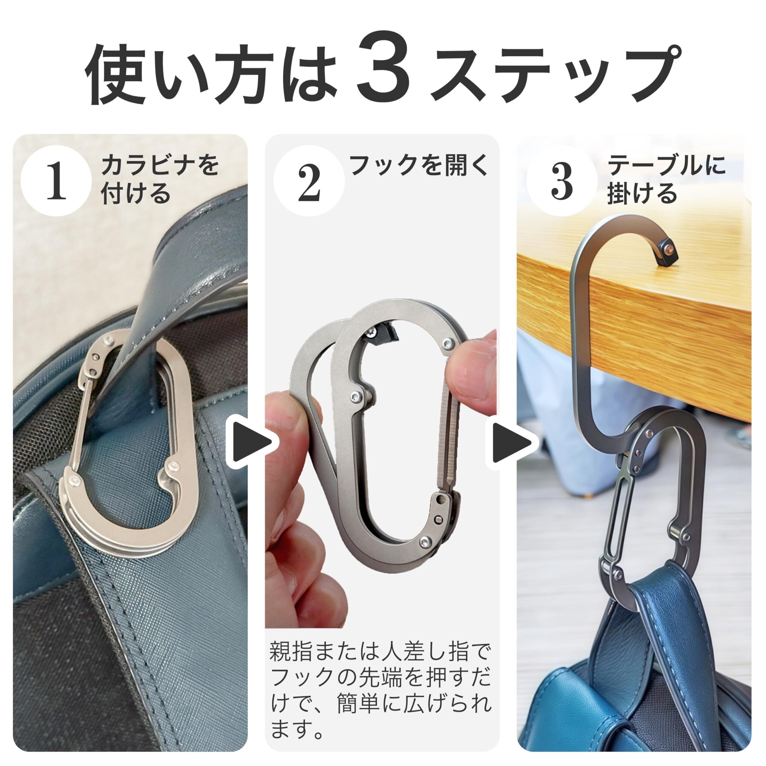 【瞬時に変形する2WAY構造】普段はカラビナとして使用でき、テーブルや棚に掛ければ即席のバッグハンガーに早変わり。使わないときはコンパクトに折りたため、ポケットやバッグの持ち手に掛けて常に携帯可能。