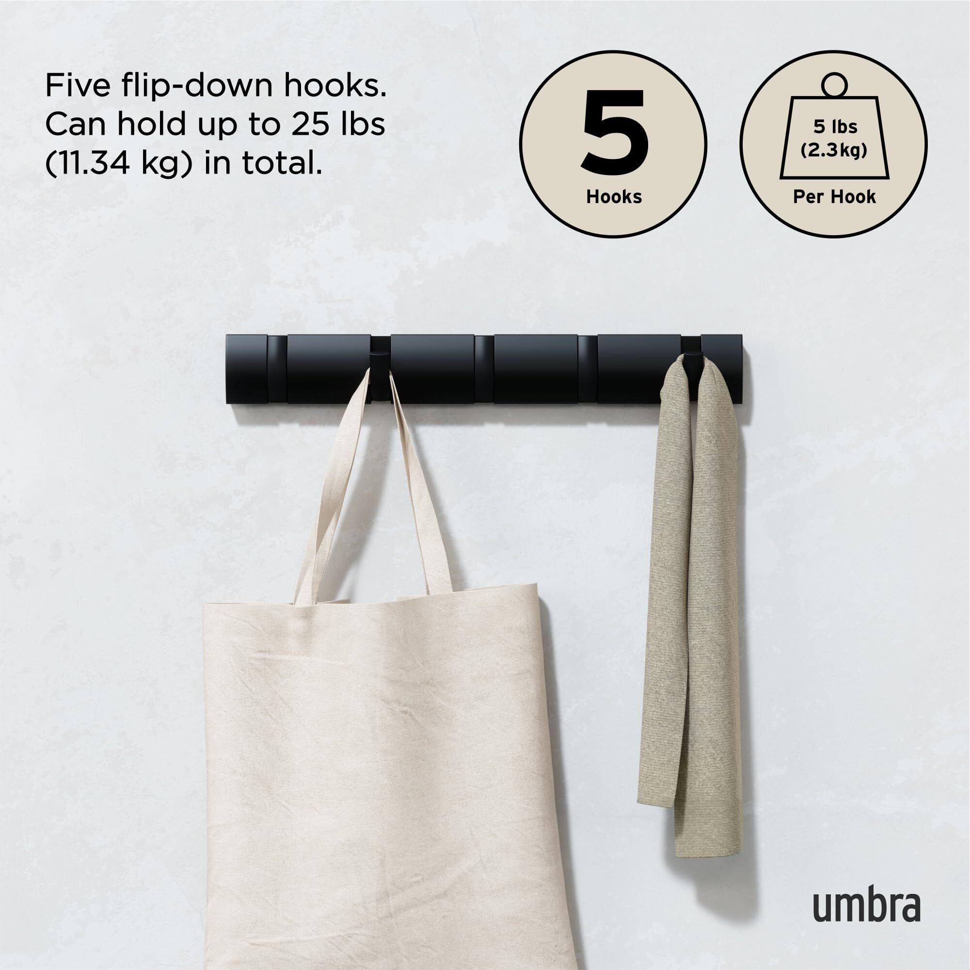 多目的壁掛けハンガー:アンブラ フリップは、コートラックだけでなく、コート、スカーフ、財布、傘、タオル、衣類などのさまざまなアイテムを吊るすための折りたたみ式フックを備えた、ユニークな壁掛けレールです
