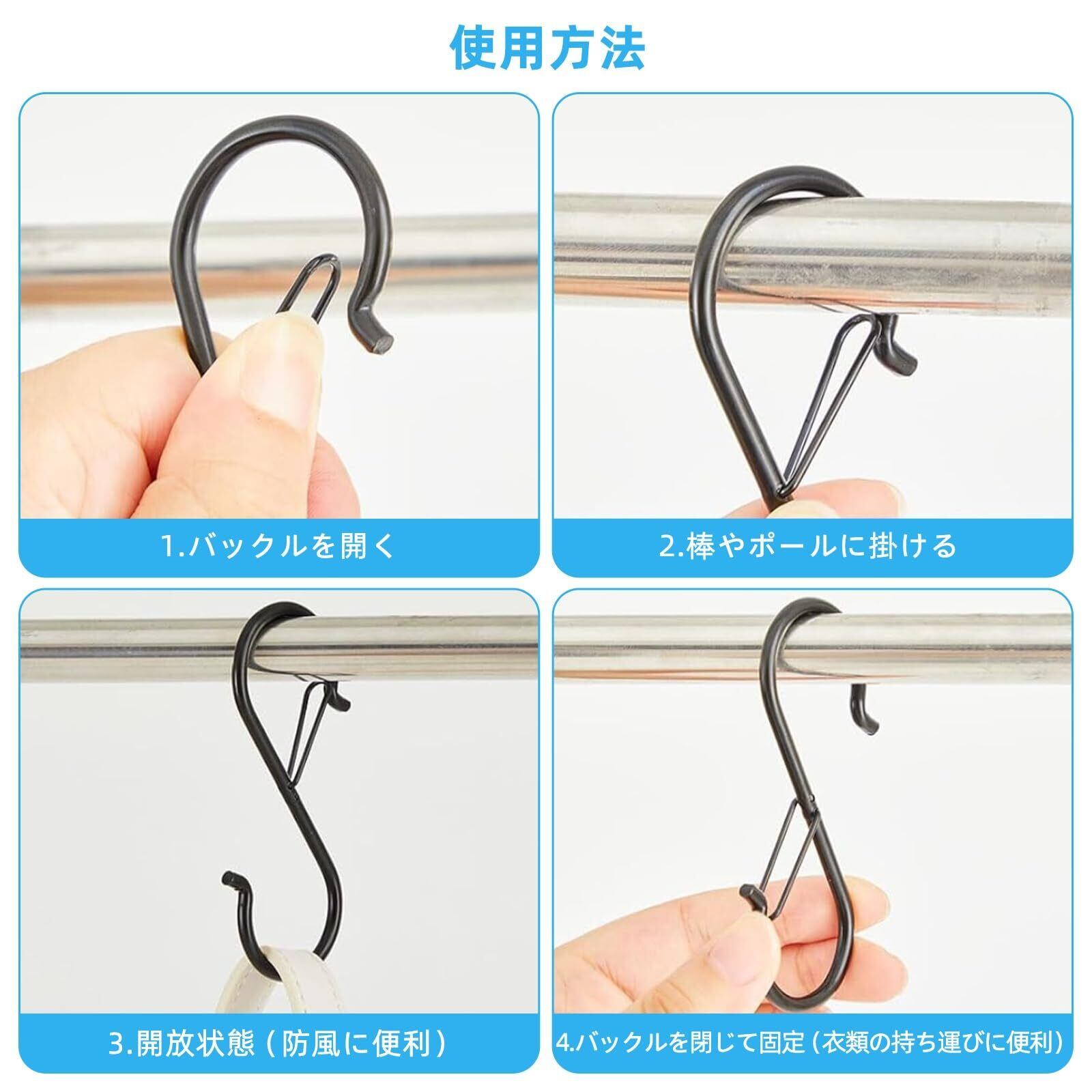 使いやすいサイズ設計:防風フックは9.2 × 3.5cmの扱いやすいサイズで、ほとんどの直径のハンガーロッド、物干しラック、手すりにしっかりフィットします。ステンレススチール製で、シルバーとブラックの2色から選べるシンプルかつ汎用性の高いデザイン。10個セットのため、住宅はもちろん、賃貸物件、寮、屋外など、さまざまな場所で便利にお使いいただけます