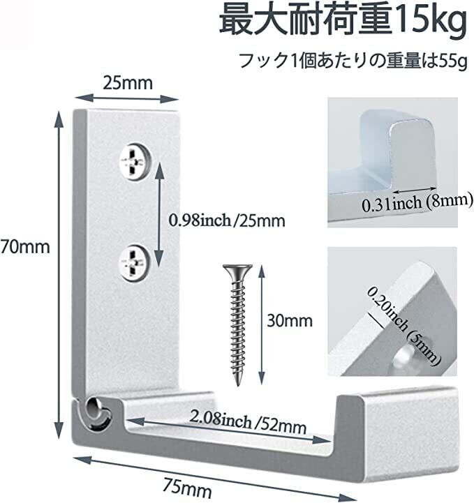 アルミニウム合金製 壁掛けフック シルバー 2個 キッチン バス トイレ 収納 折りたたみ式 フック ネジ止め 用 シンプル 銀色