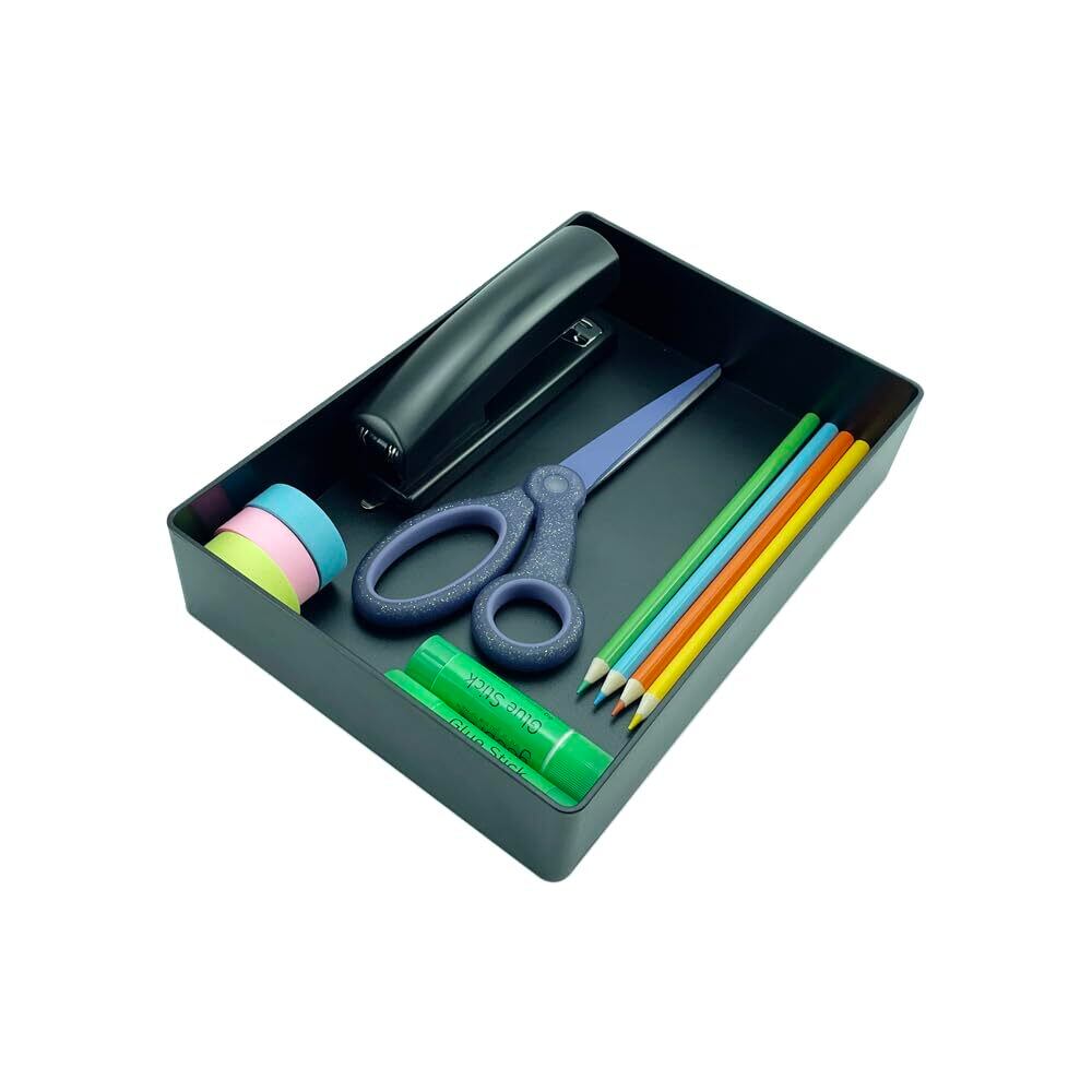 ホッチキス、テープディスペンサー、ペンホルダーなどのデスクトップアクセサリーをすっきりと収納できるアクセサリートレイ。