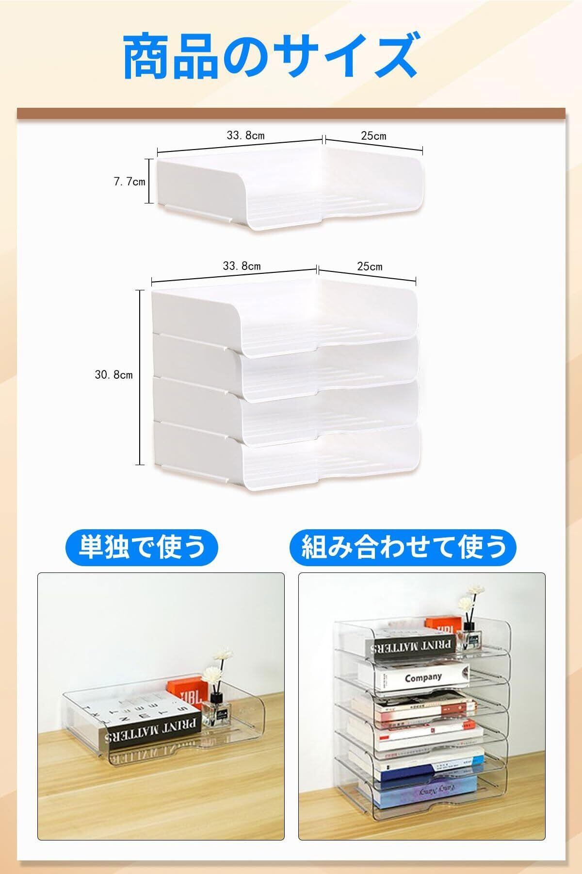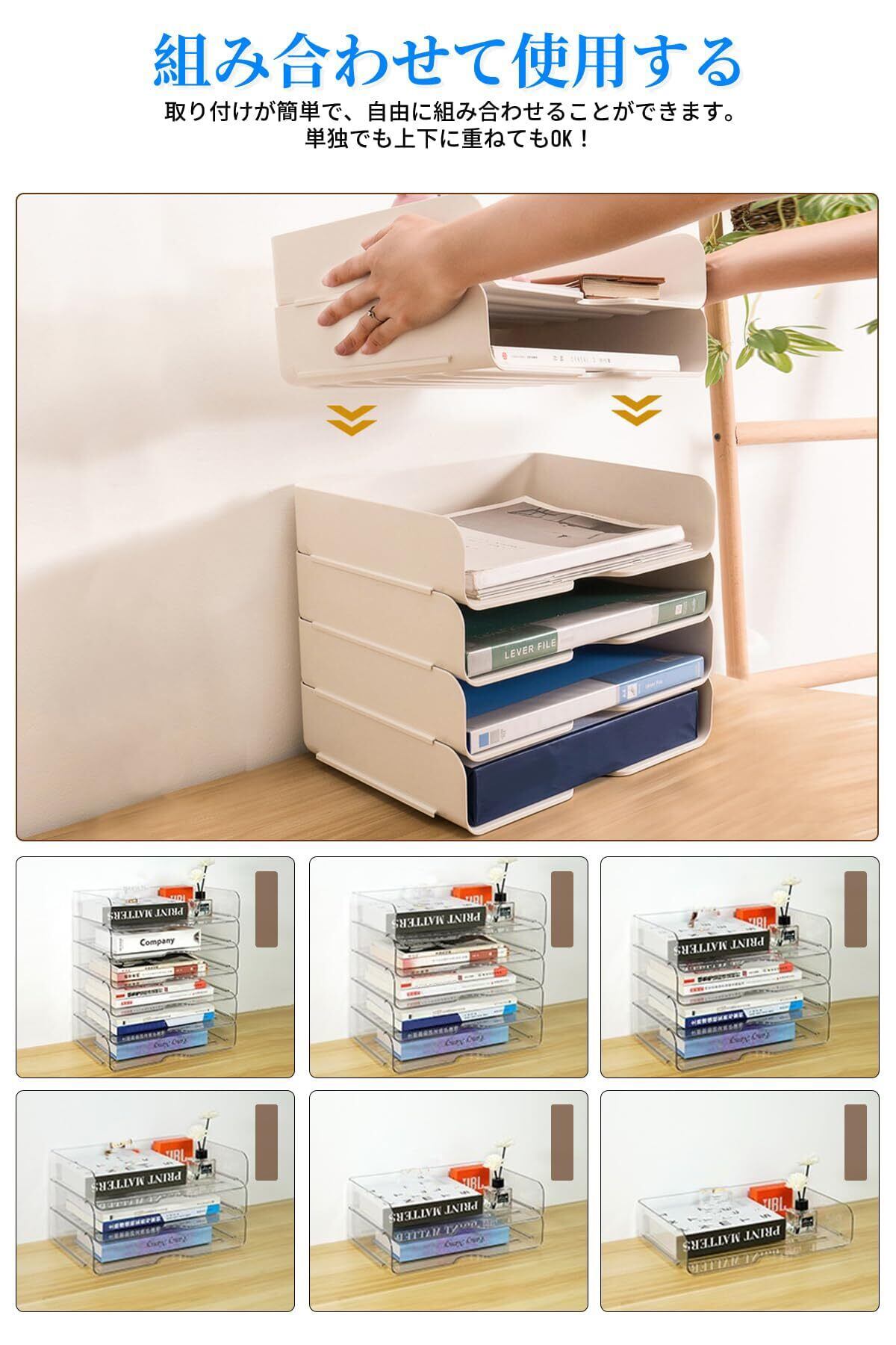 A4ヨコ置き3段書類トレー 書類ケース 収納ケース 卓上 浅型 積み重ね可能 レターケース 、レタートレイ、ブックなど収納 (ホワイト, 4pcs/set)