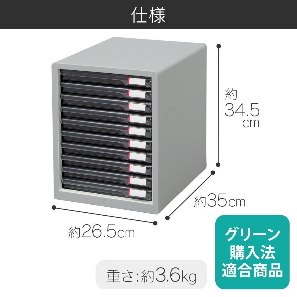 A4クリアファイルがすっきり収納。10段の引き出しで書類を細かく分類。インデックスシール付きで分類した書類もすばやく取り出せます。ゴム脚付きで滑りにくいのでストレスなく引き出せます。丸みを帯びたフォルムでインテリアにも。