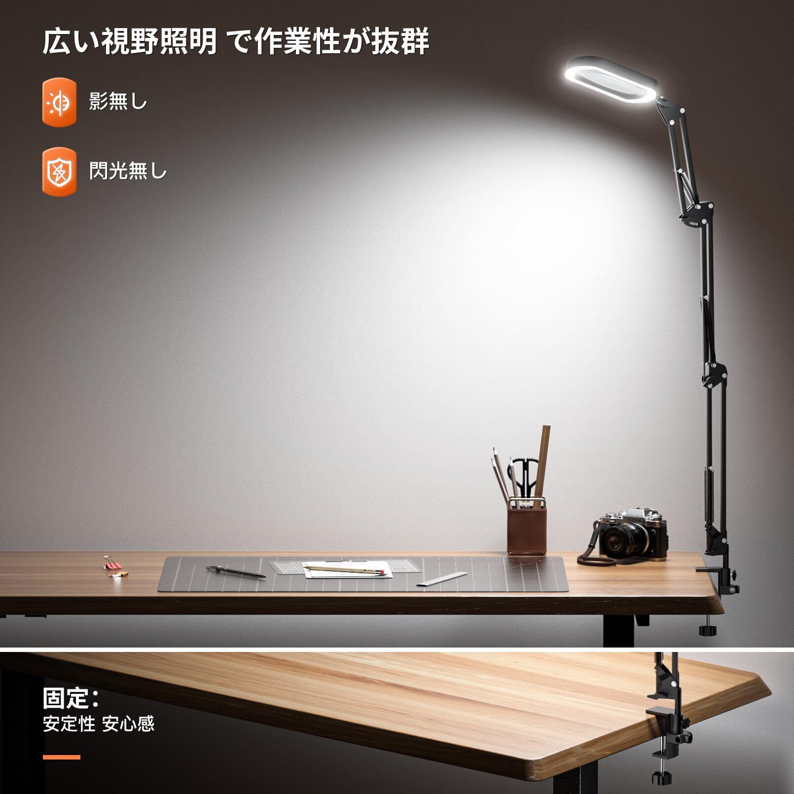 安定性抜群の3本アーム設計 この拡大鏡は、影やちらつきのない広い範囲を照らす堅牢な3本アーム構造を採用。作業に集中できます。不安定なスタンド型とは異なり、デスクにしっかり固定できるため安全性と信頼性に優れています。使いやすく、クラフト愛好家や高齢者にも最適。実用性と安心感を兼ね備えています。