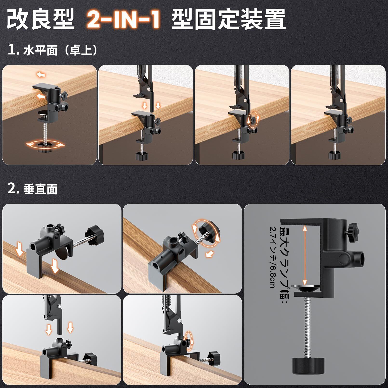 安定性と柔軟性を兼ね備えた取り付け 耐久性に優れた金属製クランプ(最大クランプ幅2.7インチ/6.8cm)を採用したこの拡大鏡付きランプは、伸縮式アームにより多様な設置が可能です。ほとんどのデスク、作業台、テーブルの縁(水平・垂直方向)に確実に固定でき、数秒で堅固にロックされる構造で、安定した作業環境を実現します。360°回転ジョイントにより柔軟な省スペース照明調整が可能で、趣味家からプロフェッショナルまで幅広く活用できます。