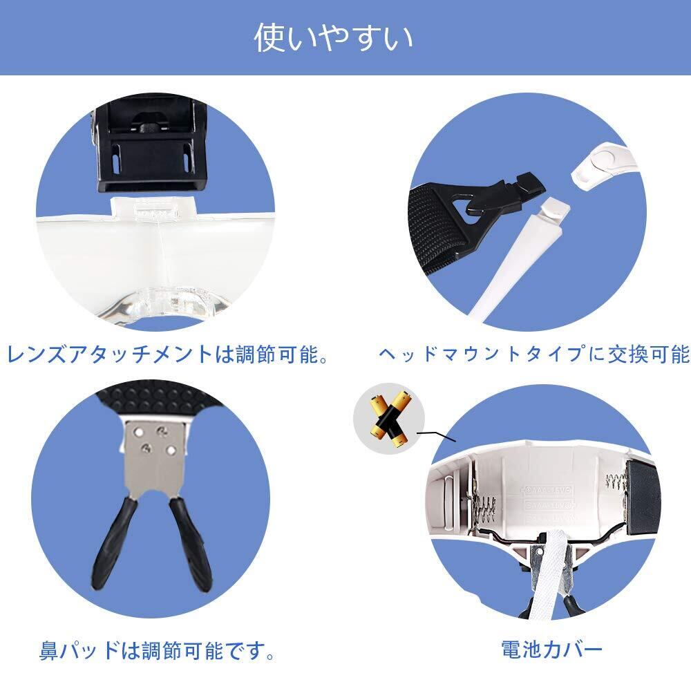 【両手自由に使え】眼鏡との重ねけもできるので眼鏡を掛けたままでも使えるので、いちいち眼鏡を外す必要がありません、細かい作業が楽々、効率もアップ。いろんな場所に大活躍:小さな文字を読むだけでなく、お裁縫時の糸通し、模型工作、趣味の細かい作業等に最適ヘッドルーペです敬老の日のプレゼントにもおすすめ。