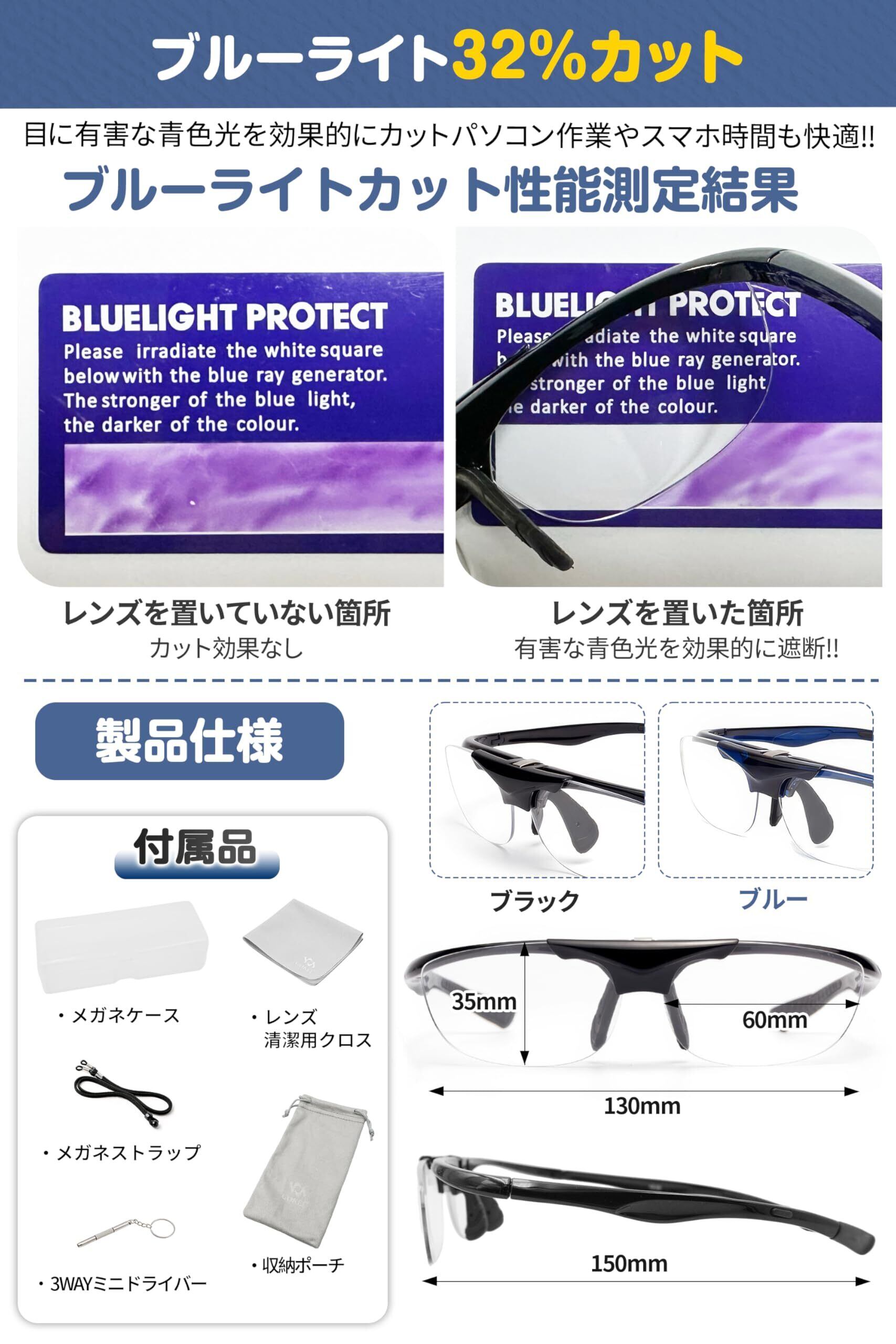 【ブルーライト32%カット・充実の6点セット】ブルーライトを32%カットするので、パソコン作業やスマホ時間も快適。レンズは目に有害な青色光を効果的にカットするブルーライトカットレンズを使用しています。スマホやタブレット対策として、パソコンやスマホなどのデジタル機器を長時間使用する方、また目の健康が気になる方にお勧めです。丈夫なヒンジを使用、何度開閉しても壊れません。丁番やパットのネジ等のあるメガネはご使用されてるうちに緩みます。定期的に付属のドライバーで締め直してください。頑丈な専用メガネケースが付属、ケースに収めれば持ち運びも簡単。1.拡大鏡メガネ(ルーペ) 2.めがねハードケース 3.メガネストラップ 4.収納ポーチ 5.レンズ清潔用クロス 6.3WAYミニドライバー