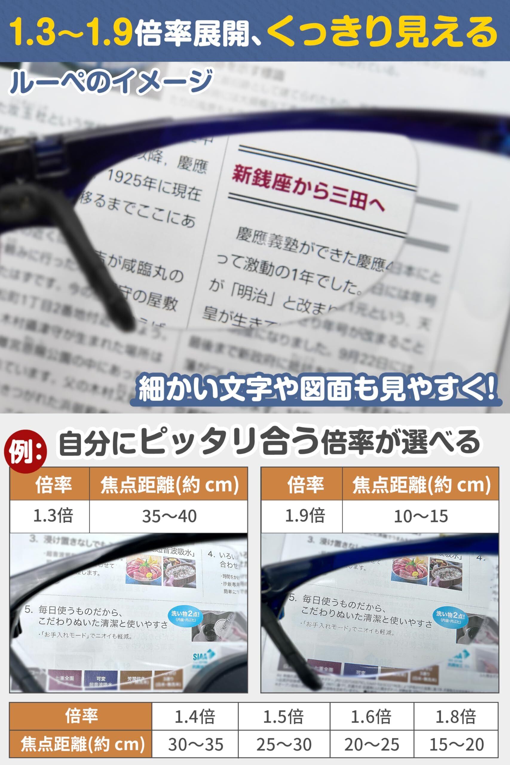 【最新型メガネ型ルーペ・倍率約1.6倍】倍率約1.6倍は、対象物から約20~25cmほど離れて見える最大倍率です。メガネ型ルーペは近用の文字等を見やすく(拡大)する事を目的に作られています。目とレンズの距離、レンズと対象物の距離により見え方が変わりますので、焦点距離を調整し、見やすい距離でご使用ください。※視力や焦点距離には個人差があります。見えにくい場合は、レンズの倍率や焦点距離が合っていない可能性があります。近距離用であり、遠くを見る目的では使用できません。倍率合わないや初期不良はもちろん、通常使用での破損も対象となります。
