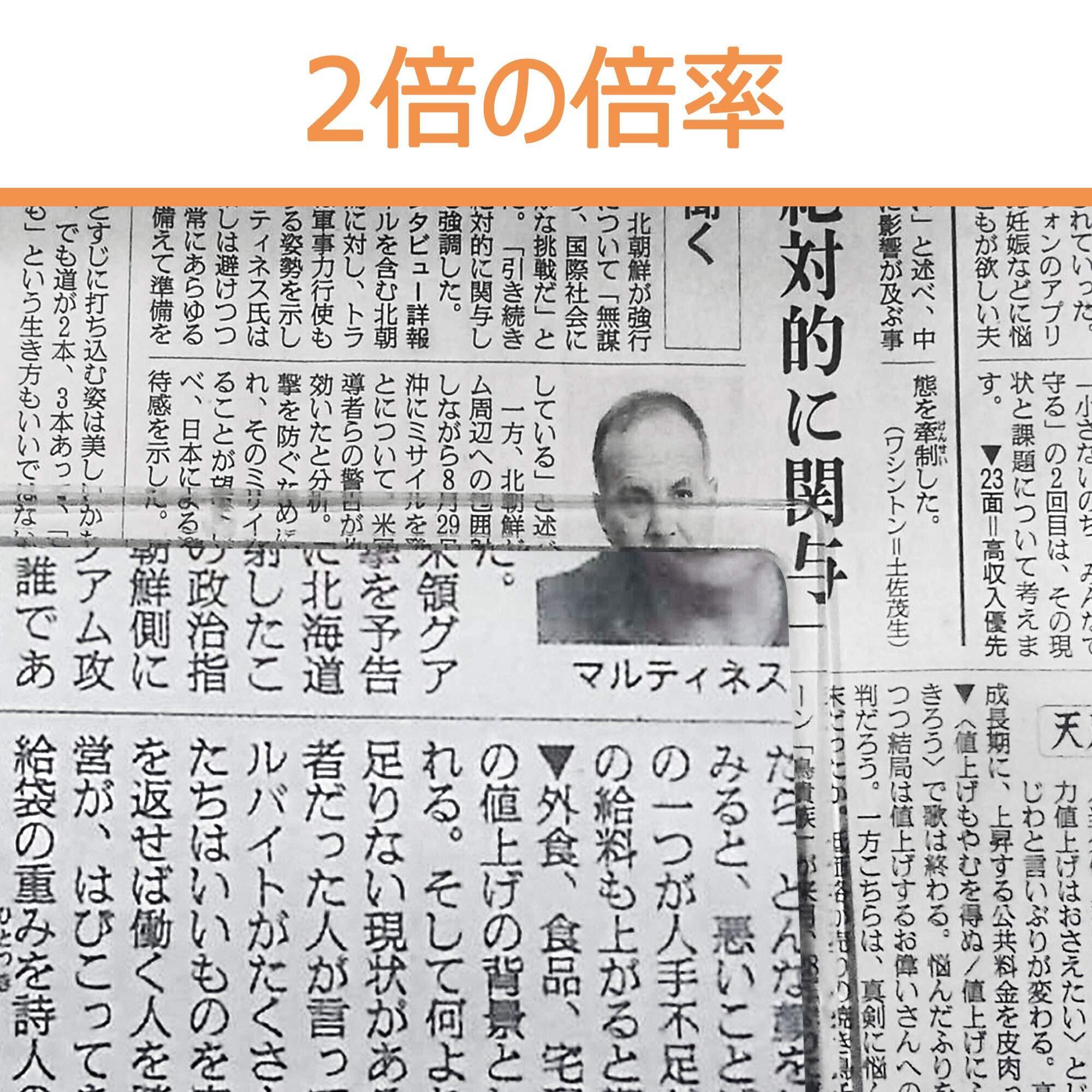 【a4 読書 拡大鏡倍率 】 2倍率拡大レンズは、本、地図、新聞を読むのに最適です。拡大鏡とオブジェクトとの最適な距離は約8~10センチ(約カード1個分の高さ)です。拡大シートを持ち上げながら読むことを心得る必要があります。