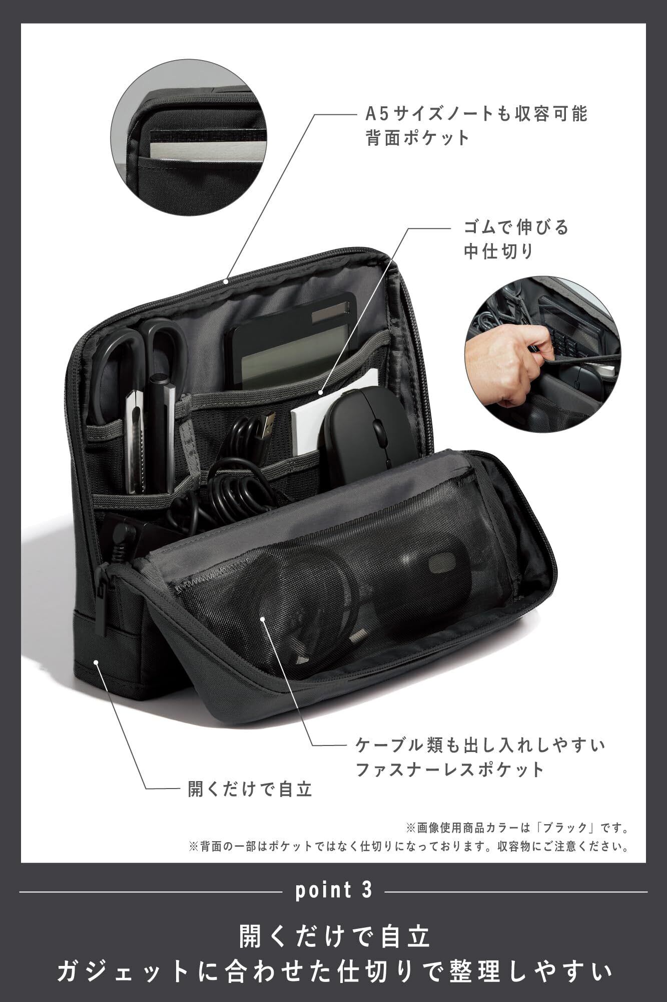 ●文房具やガジェットなど仕事に必要なツール一式の収容に適したポケット設計。