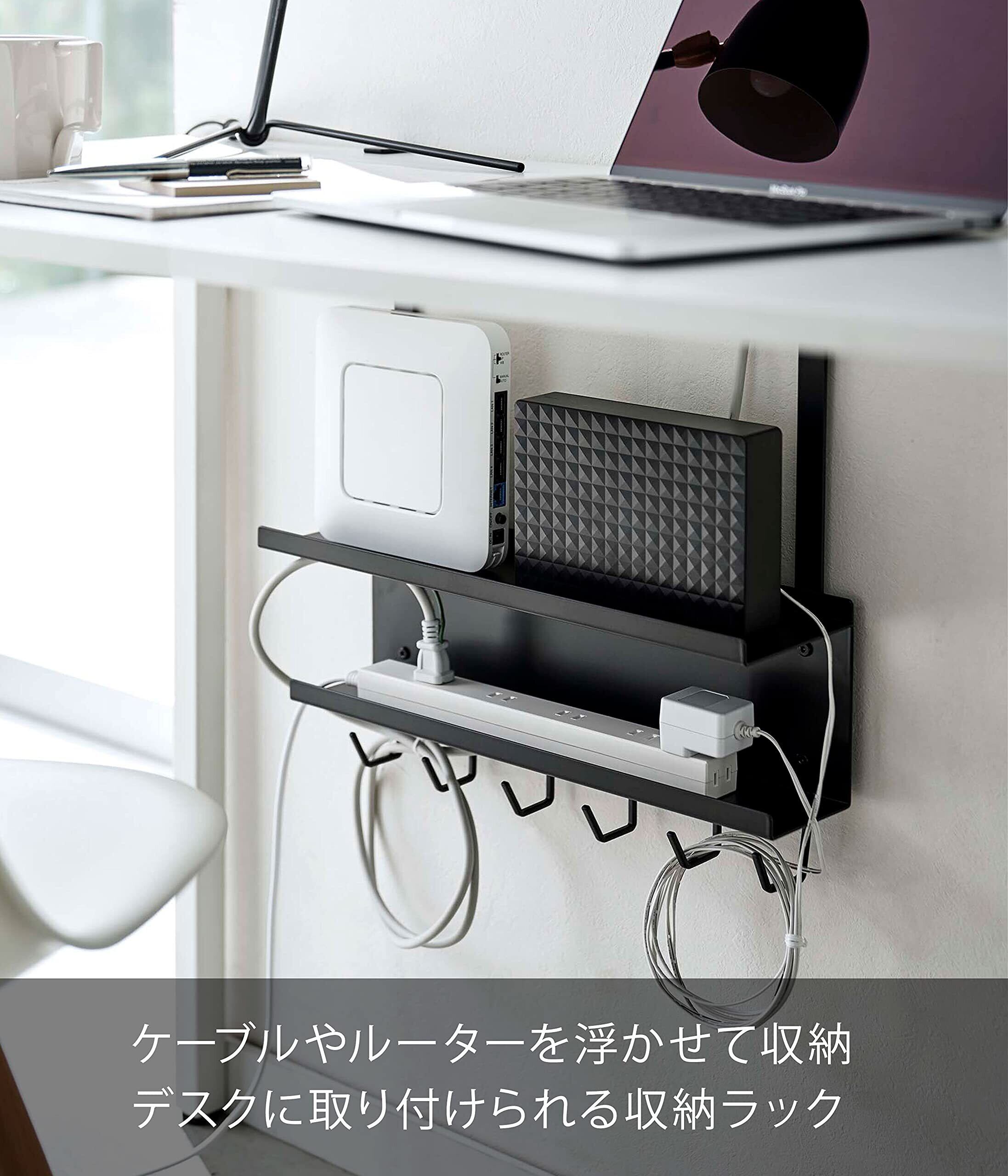 デスクの天板を挟むだけの簡単取付! ケーブルやルーターを浮かせて収納。