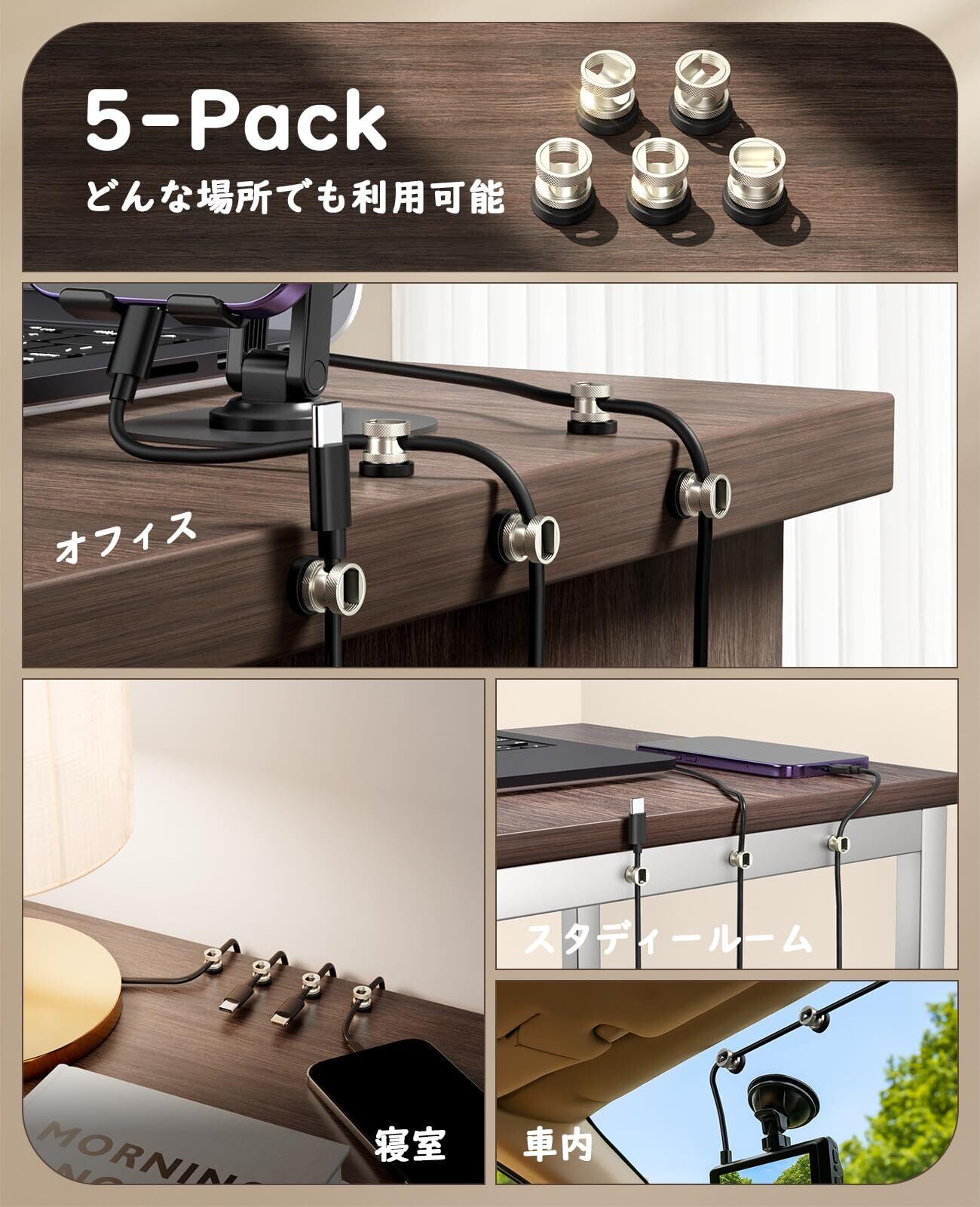 「多機能でデスクや車内でも活躍」このケーブルオーガナイザーはオフィスや自宅のデスクだけでなく、車内でも大活躍!ケーブルが散らかることなく整理でき、デスクや車内をスッキリ保つことができます。ケーブル整理だけでなく、車内での使用にもぴったりです。
