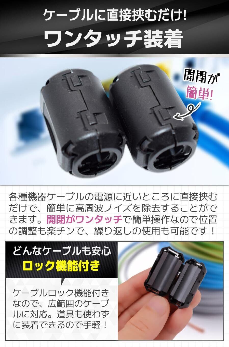 【ワンタッチ装着】各種機器ケーブルの電源に近いところに直接挟むだけで、簡単に高周波ノイズを除去することができます。開閉がワンタッチで簡単操作なので位置の調整も楽チンで、繰り返しの使用も可能です!