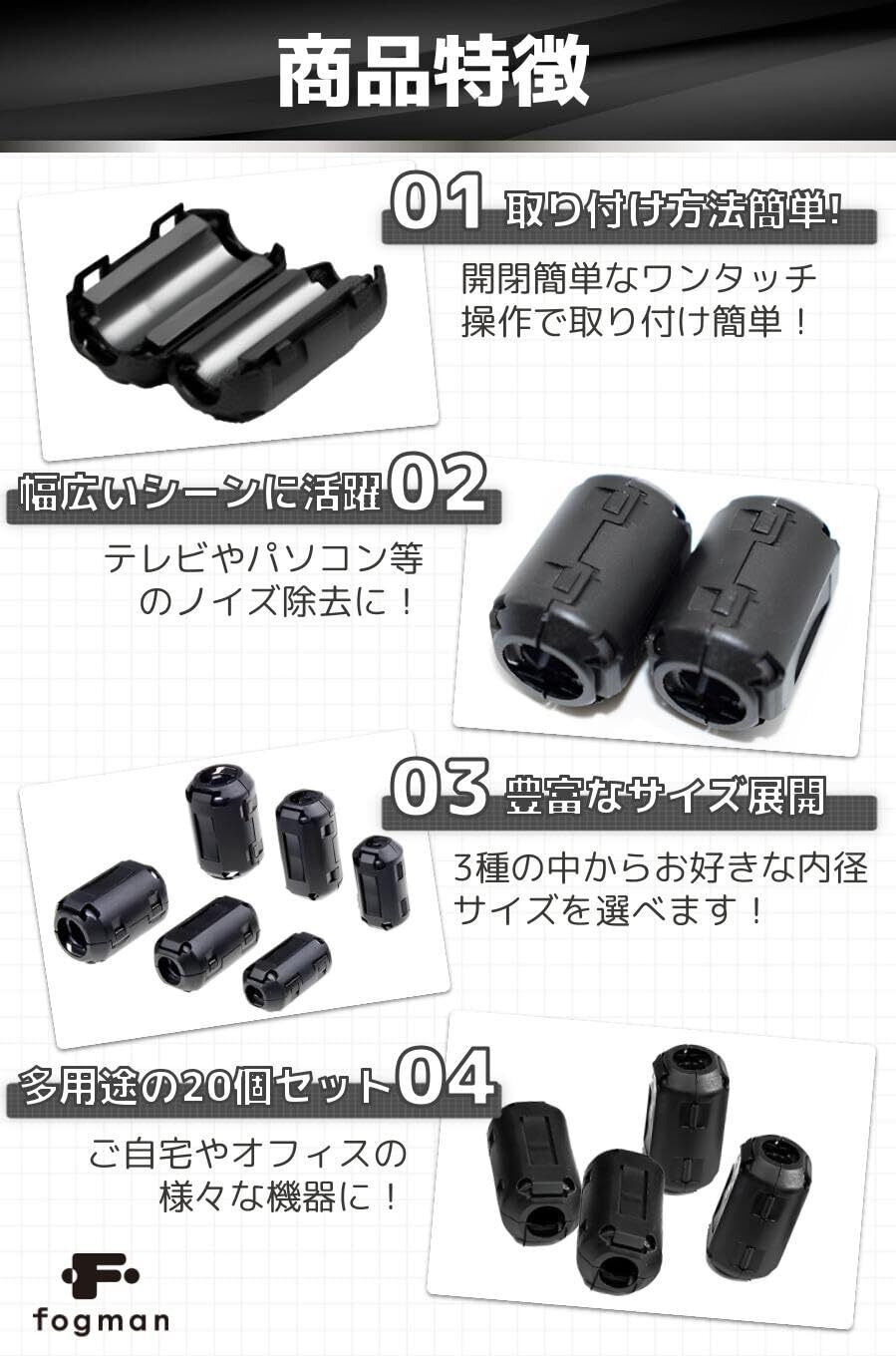 【商品特徴】①取り付け方法簡単!:開閉簡単なワンタッチ操作で取り付け簡単!/②幅広いシーンに活躍:テレビやパソコン等のノイズ除去に!/③豊富なサイズ展開:3種の中からお好きな内径サイズを選べます!/④多用途の20個セット:ご自宅やオフィスの様々な機器に!