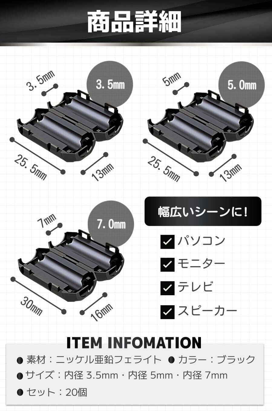 【商品詳細】素材:ニッケル亜鉛フェライトカラー:ブラック/サイズ:内径 3.5mm・内径 5mm・内径 7mm/セット:20個/