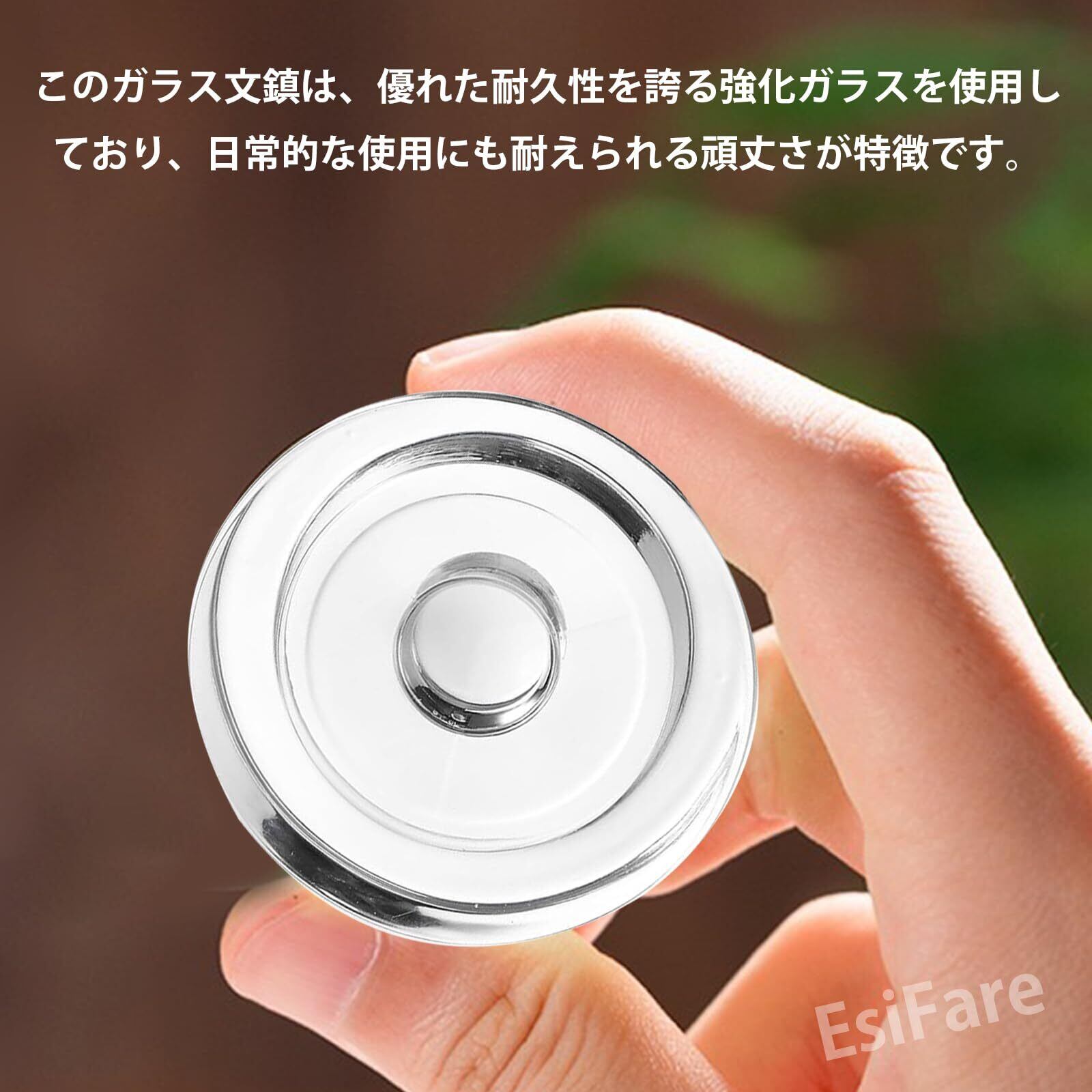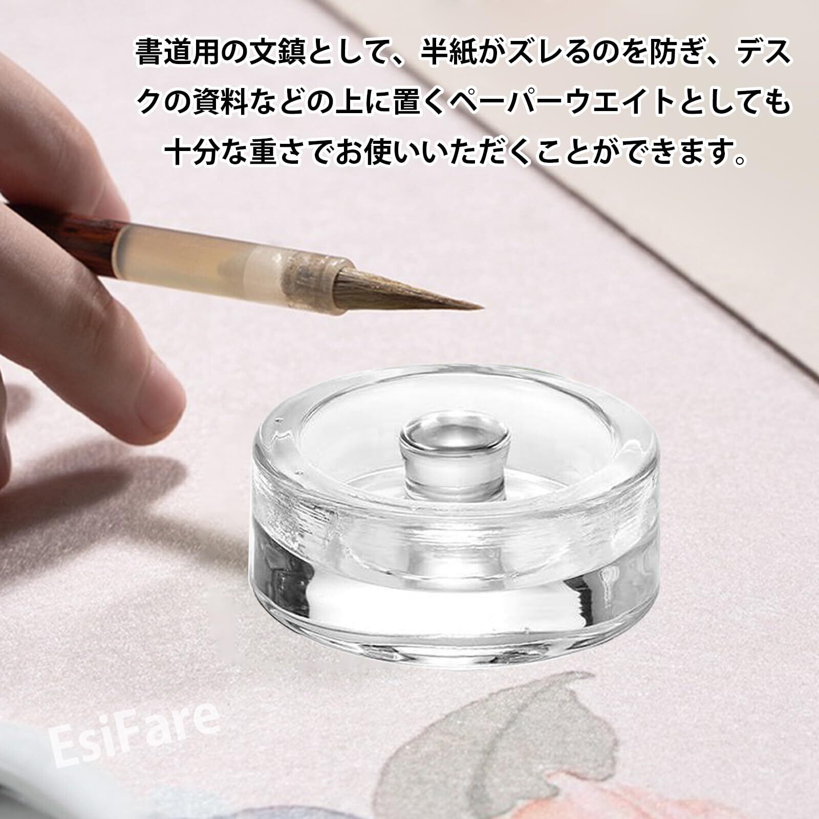 【製品の詳細】丸型ペーパーウェイトのサイズ:7×7×3.8 cm;素材:ガラス; セット内容:2個セット;重量:1つ約180g。 書道用の文鎮として、半紙がズレるのを防ぎ、デスクの資料などの上に置くペーパーウエイトとしても十分な重さでお使いいただくことができます。
