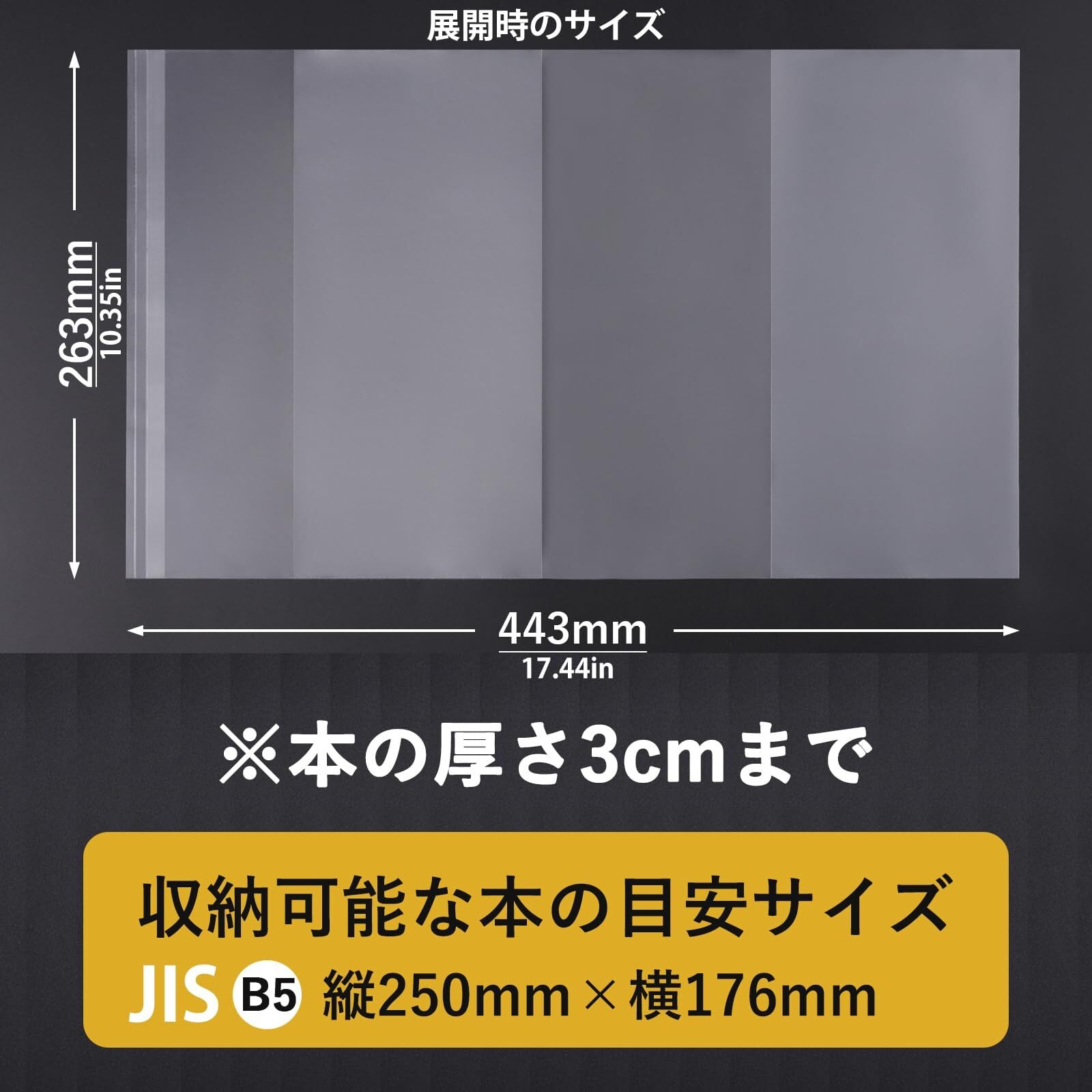 【サイズ】 展開時のサイズは263mm×443mm;収納目安サイズ(B5判)257㎜×182㎜;収納可能な本の目安サイズ(JIS B5)縦250mm×横176mm。※本の厚さ3CMまで