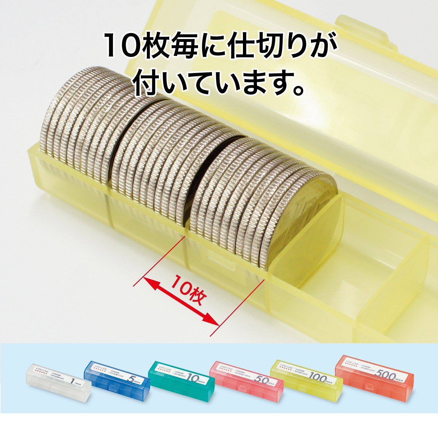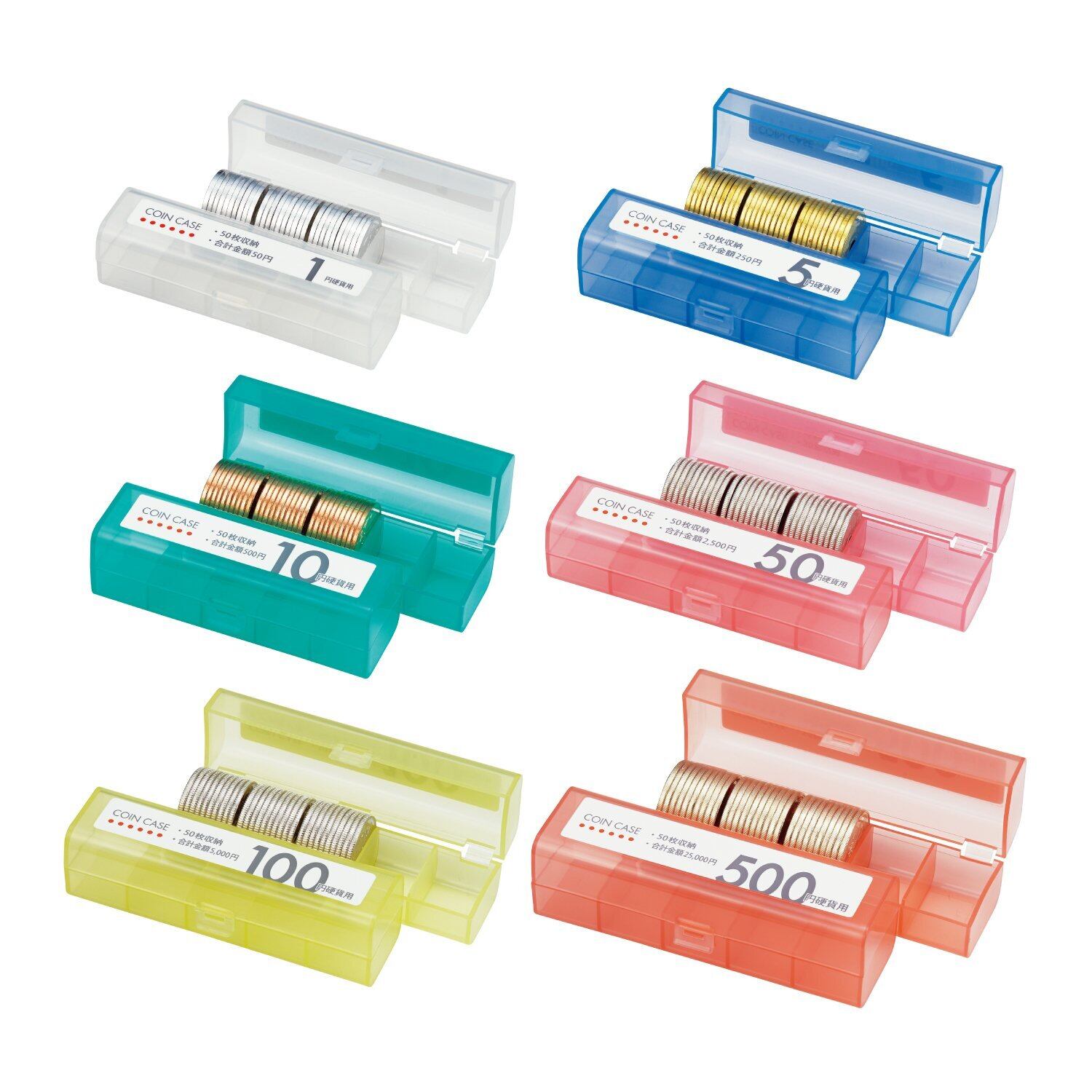 色:1円硬貨用ケース=透明、5円硬貨用ケース=青、10円硬貨用ケース=緑、50円硬貨用ケース=桃、100円硬貨用ケース=黄、500円硬貨用ケース=赤