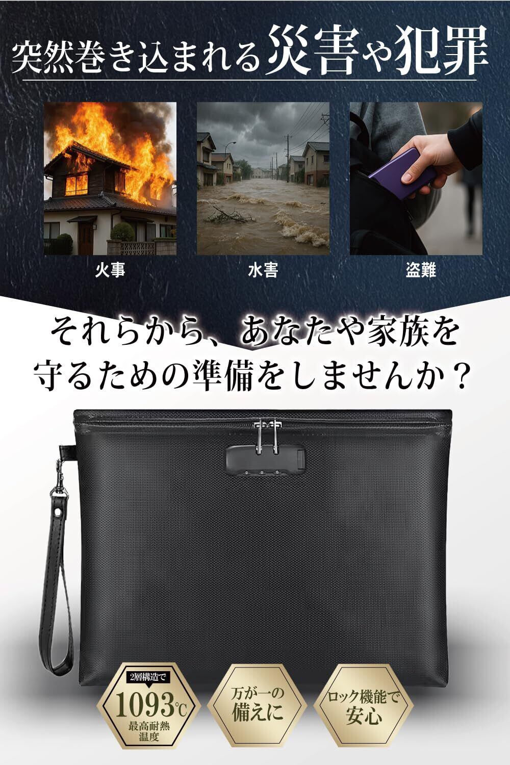 【新着商品】【 ロック付き 】【 A4サイズ対応 】 耐火バッグ ポータブル金庫 防火 防災 【 耐火温度1093℃ 国際機関検査済み 】ファスナー式 金庫 貴重品 現金 集金袋 通帳 地震 防災 防火袋 (ブラック, クラッチタイプ)