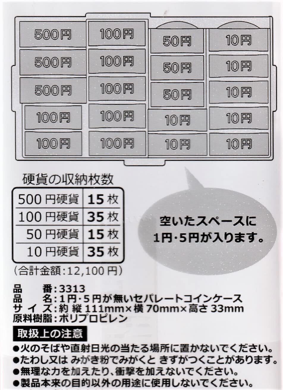 1円・5円硬貨を除外: よく使う硬貨だけを収納できるため、財布の中がスッキリ。 セパレートデザイン: 各硬貨ごとに専用の仕切りがあり、取り出しやすさ抜群。 コンパクトサイズ: ポケットやバッグにすっぽり収まり、持ち運びに便利。 高品質素材: 耐久性のある素材を使用し、長くお使いいただけます。 スタイリッシュなデザイン: シンプルで洗練されたデザインが、どんなスタイルにもマッチ。