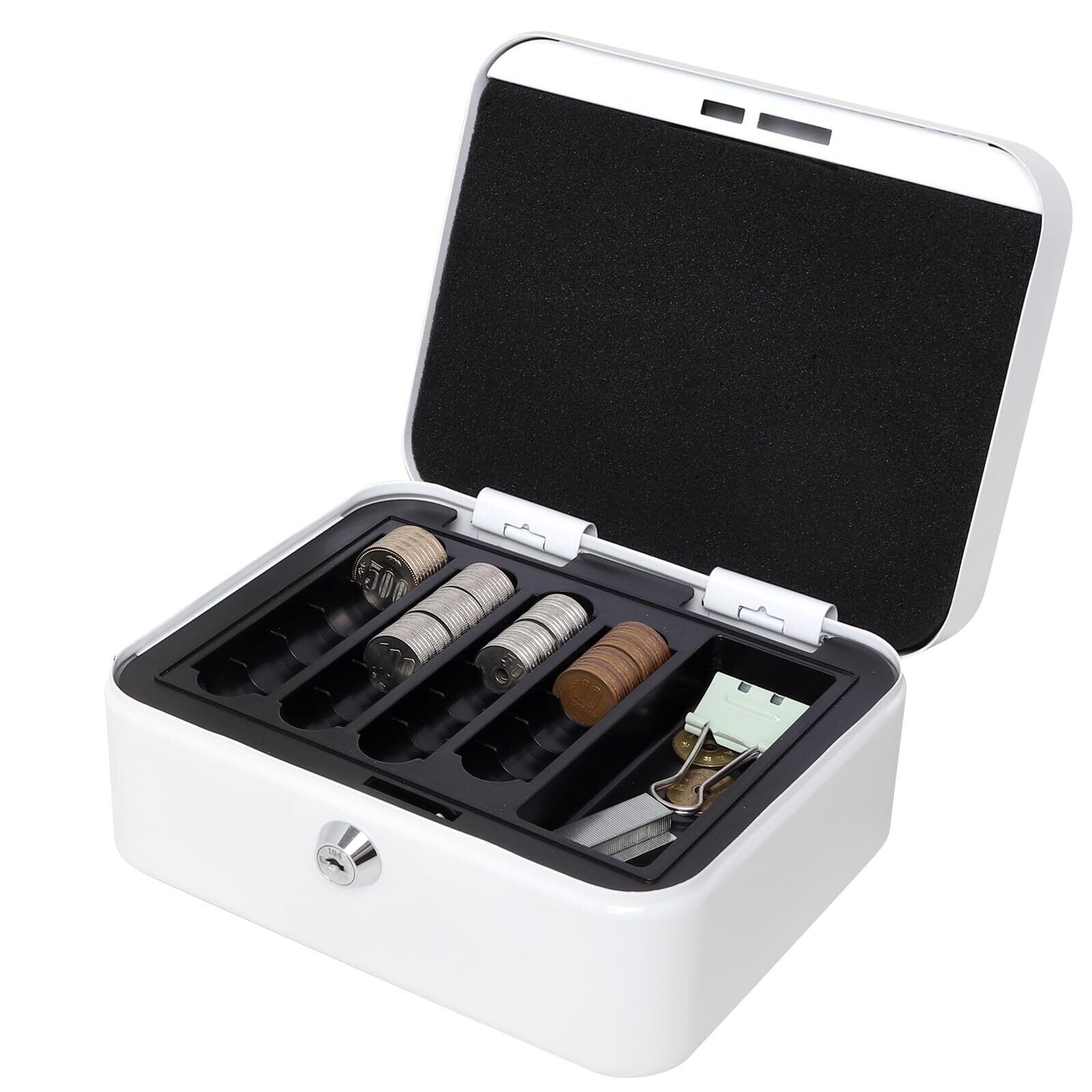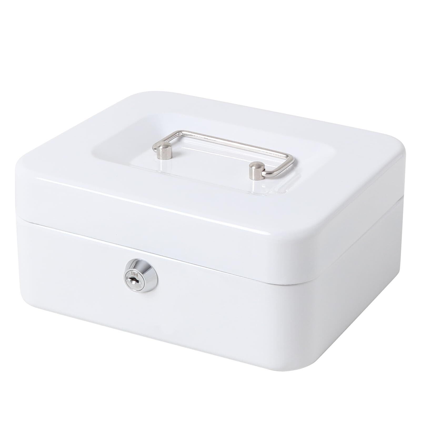 【数量限定】手提げ金庫 キーロック式 貯金箱 ミニ金庫 キャッシュボックス コイン収納 会計 家庭用 事務用品(ホワイト, S)
