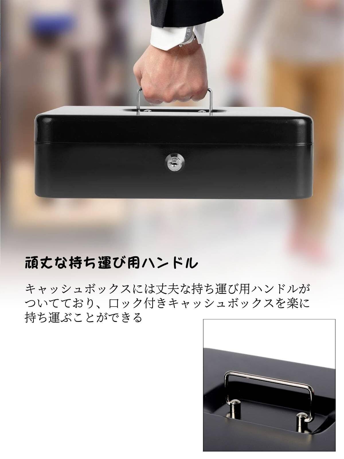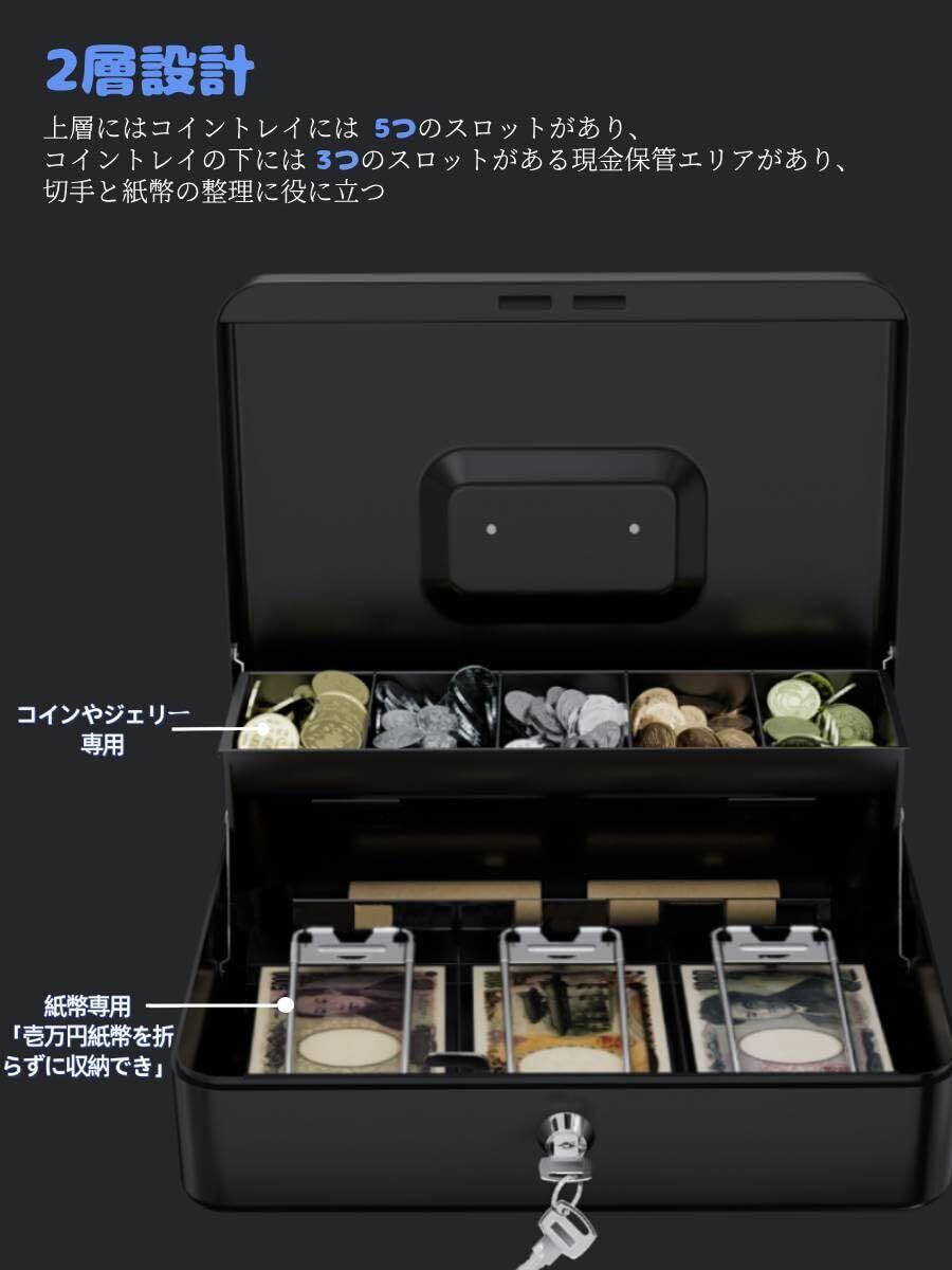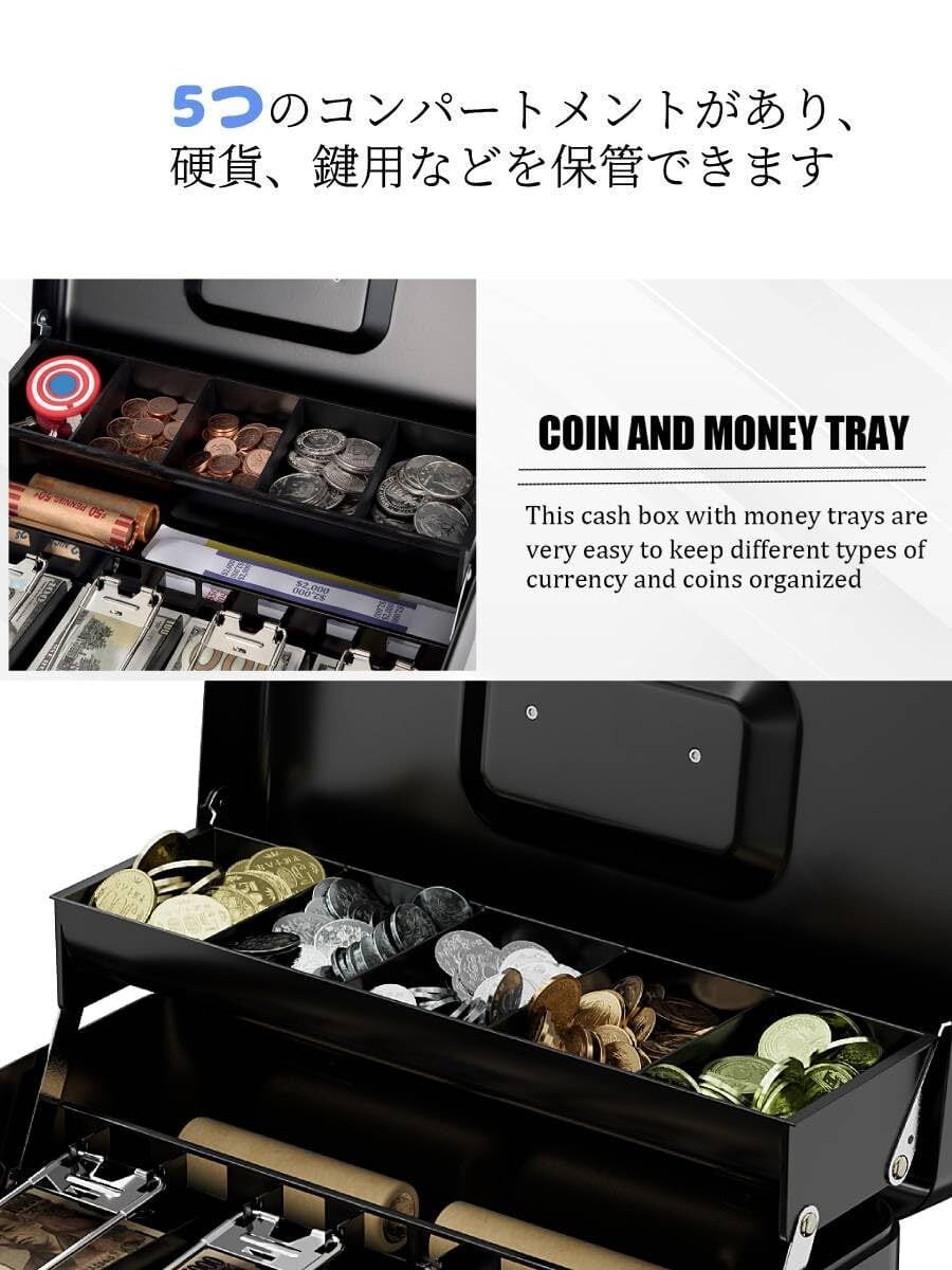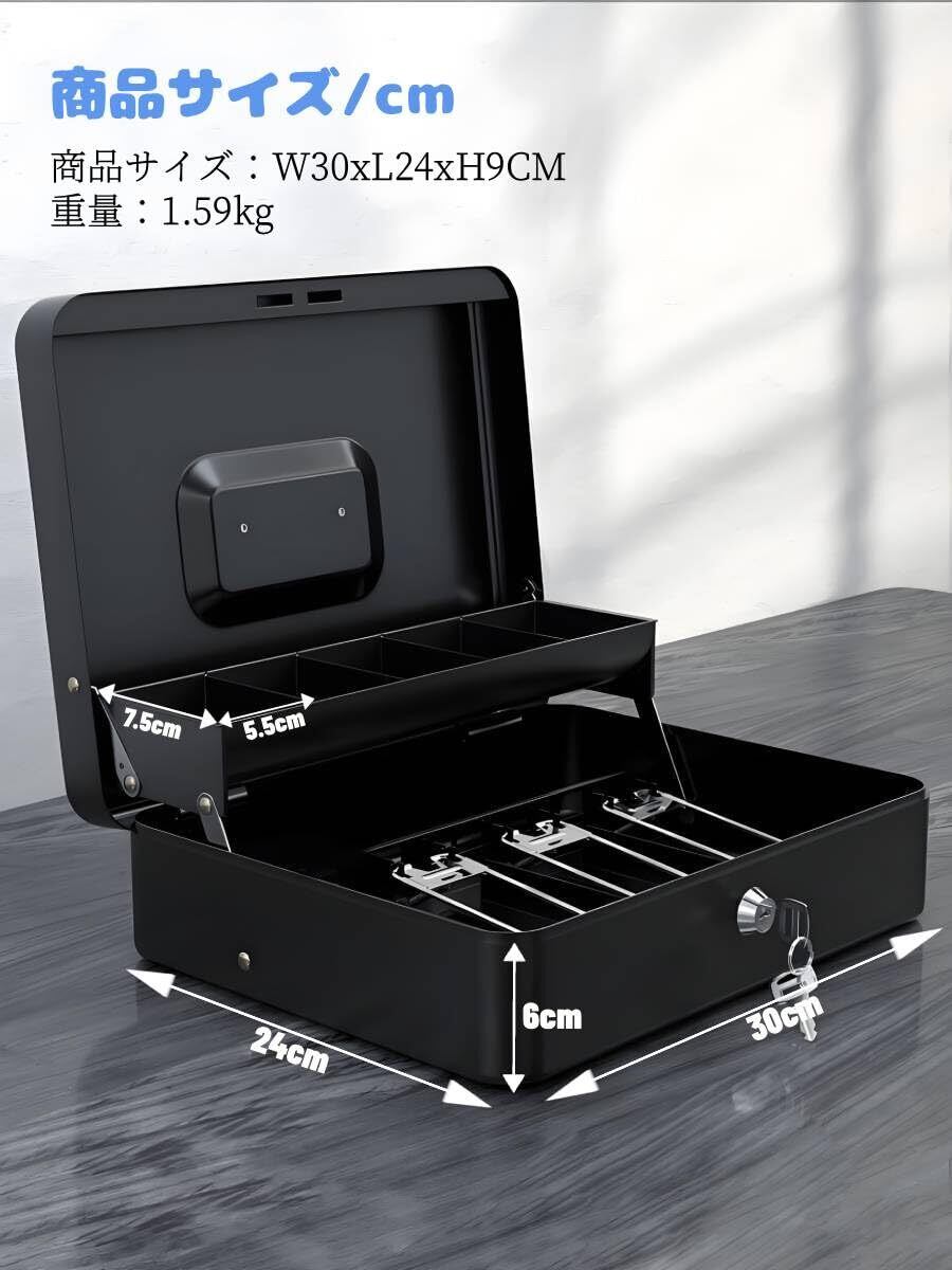 Beemyi手提金庫 キーロック式 キャッシュメイト 会計用コインケース 3つスプリングクリップ 5つコンパートメント 硬貨/紙幣整理 金属製 ミニ金庫 貯金箱 オフィス 家庭用W30×D24×H9cm (Black)